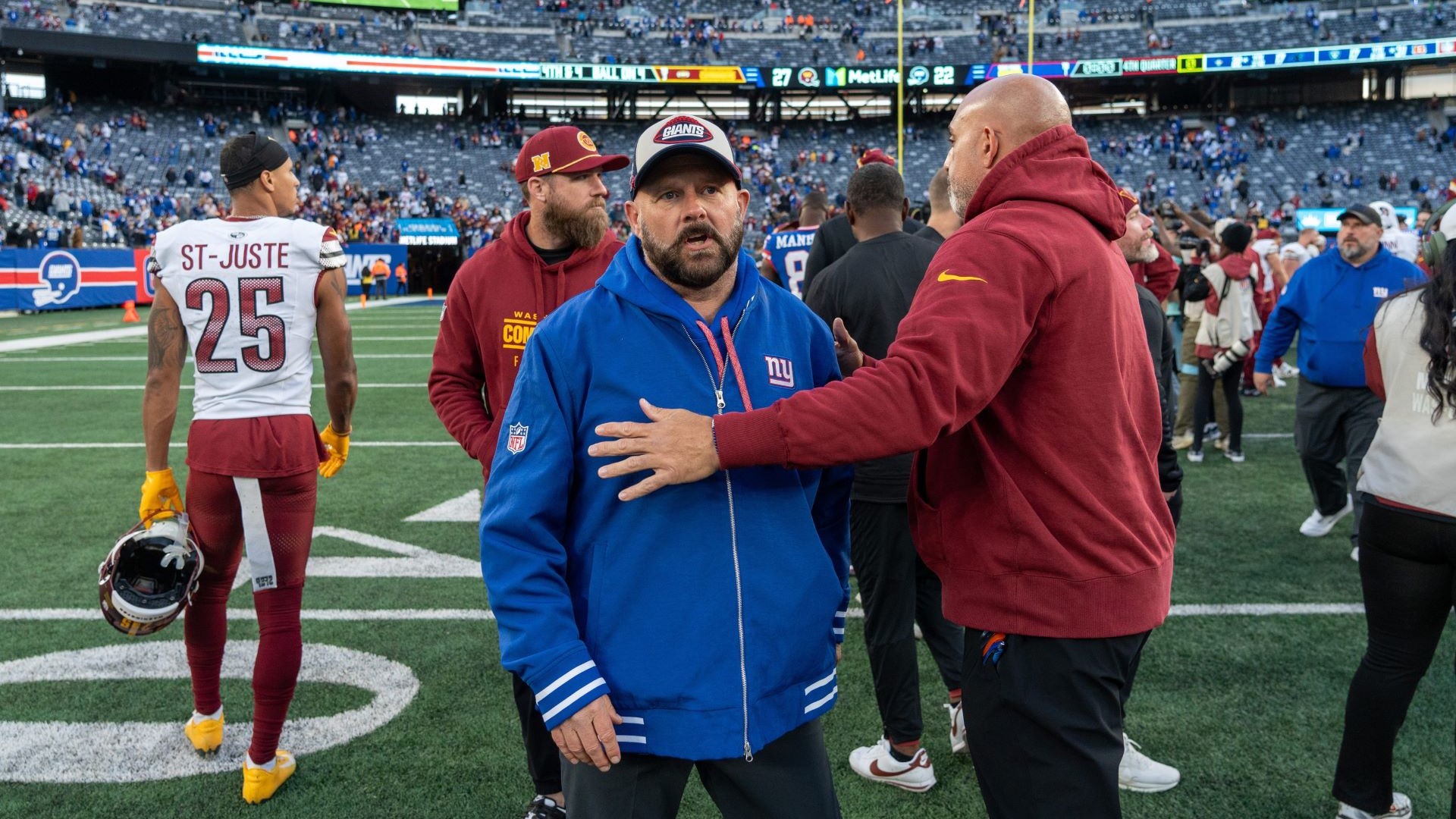 Nov 3, 2024; East Rutherford, New Jersey, USA; Washington Commanders wide receiver Terry McLaurin (17) catches a touchdown pass as New York Giants cornerback Deonte Banks (3) defends during the first half at MetLife Stadium. / Vincent Carchietta-Imagn Images
