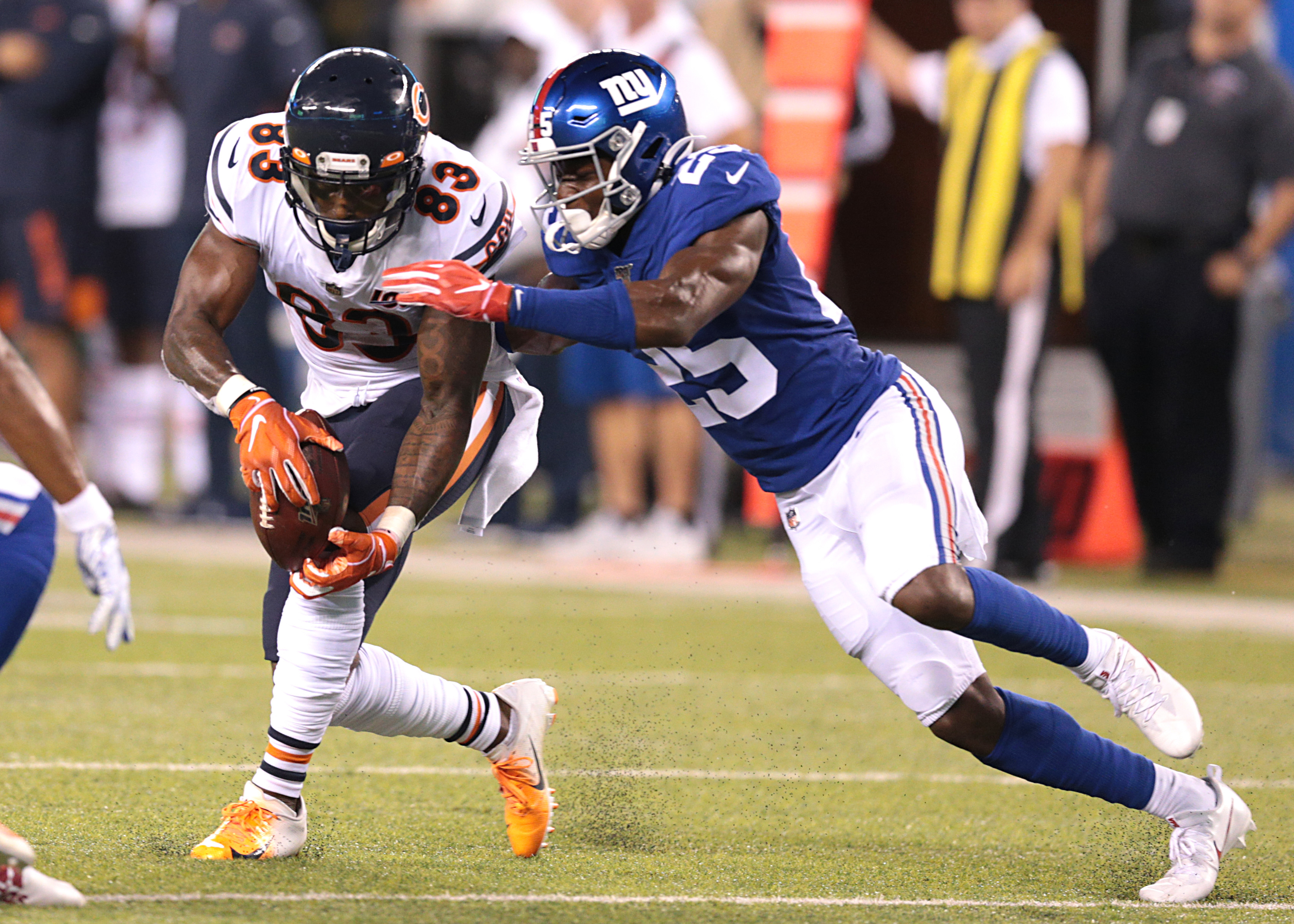 Aug 16, 2019; East Rutherford, NJ, USA; Chicago Bears wide receiver Javon Wims (83) catches a pass as New York Giants defensive back Corey Ballentine (25) tackles during the first half at MetLife Stadium. Mandatory Credit: Vincent Carchietta-USA TODAY Sports / Vincent Carchietta
