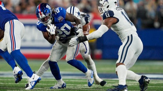 Giants unable to find end zone in 20-15 loss to CowboysBig Blue had to settle for five field goals9/27/2024, 3:30 AMLucas HutchersonNFL freelance writerSep 26, 2024; East Rutherford, NJ, US; New York Giants running back Eric Gray (20) runs out of the backfield with the ball while being tackled by Dallas Cowboys linebacker Eric Kendricks (50) at MetLife Stadium. / Julian Guadalupe-NorthJersey.com