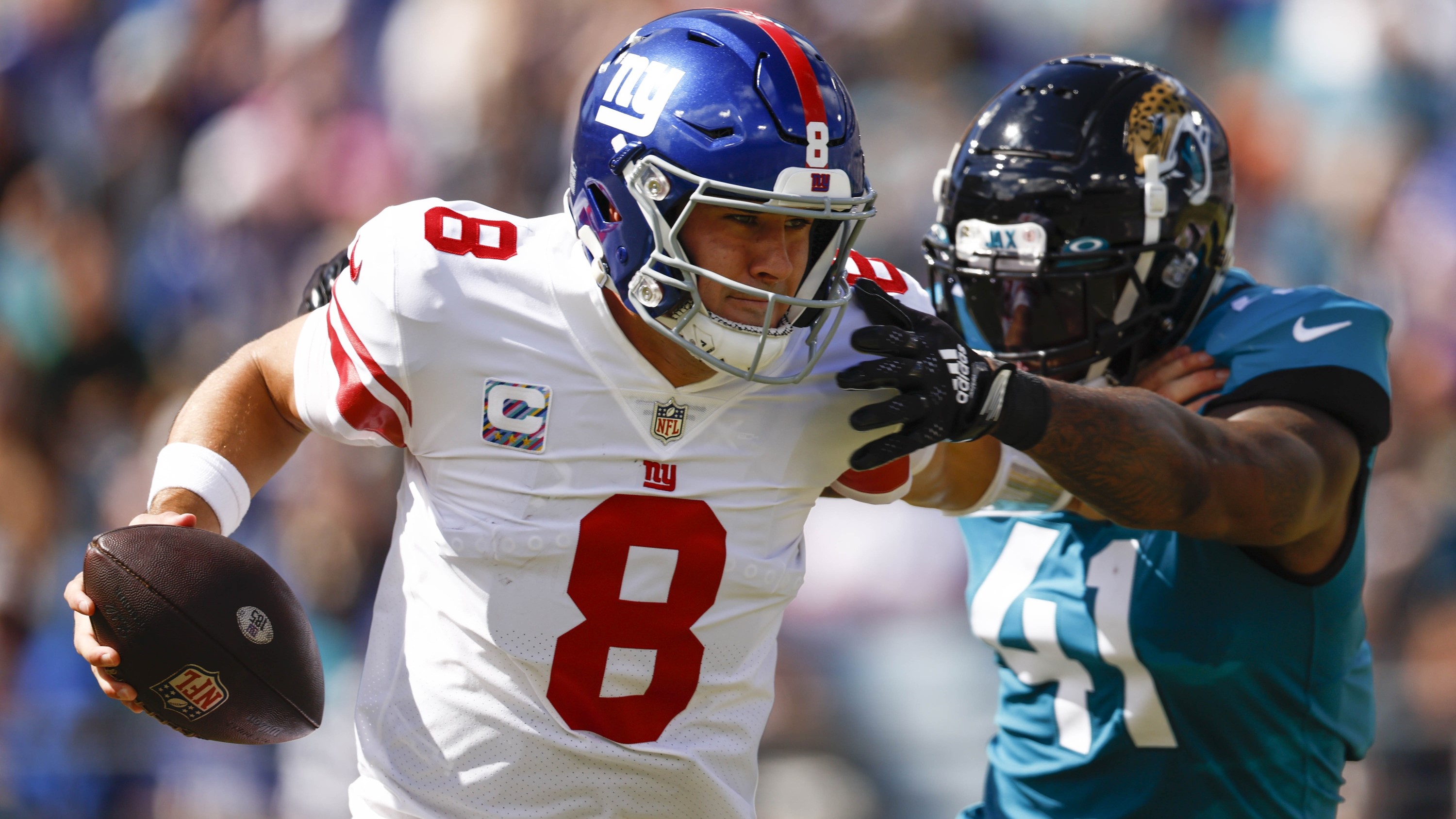 Oct 23, 2022; Jacksonville, Florida, USA; New York Giants quarterback Daniel Jones (8) scrambles with the ball as Jacksonville Jaguars linebacker Josh Allen (41) defends during the first quarter at TIAA Bank Field. / Douglas DeFelice-USA TODAY Sports