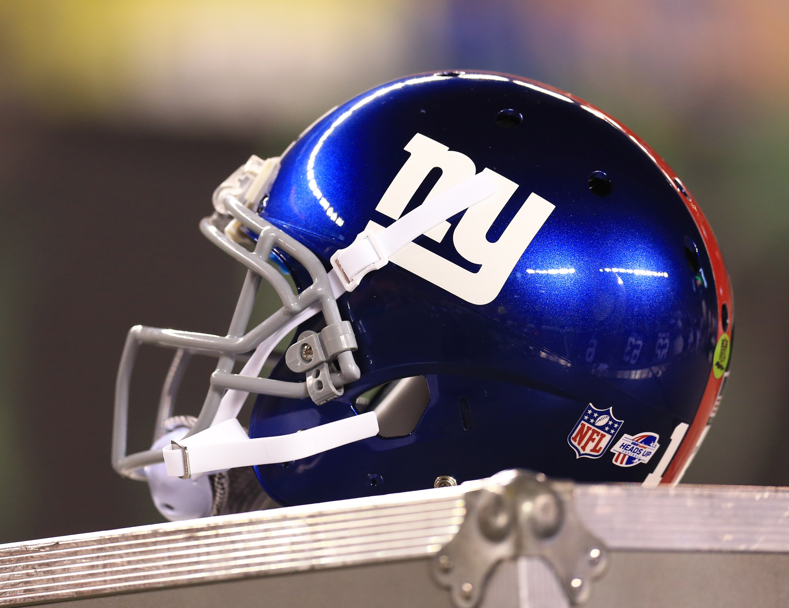 Aug 14, 2015; Cincinnati, OH, USA; Detailed view of a New York Giants helmet on the sidelines in a preseason NFL football game against the Cincinnati Bengals at Paul Brown Stadium. Mandatory Credit: Andrew Weber-USA TODAY Sports / Andrew Weber