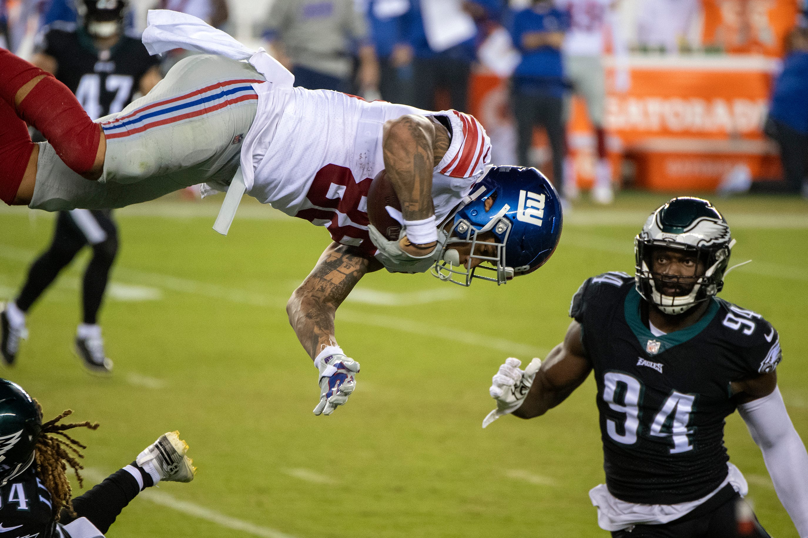 Engram laments key drop in disheartening loss to Eagles: 'It sucked not making that play''We definitely let one get away'10/23/2020, 4:50 AMAlex SmithEditorial ProducerGiants' Evan Engram (88) flips over Eagles' Cre'Von LeBlanc (34) in Philadelphia, Pa. on Thursday, Oct. 22, 2020. Jl Eagles Giants 102220 09 / © JOE LAMBERTI/COURIER POST via Imagn Content Services, LLC