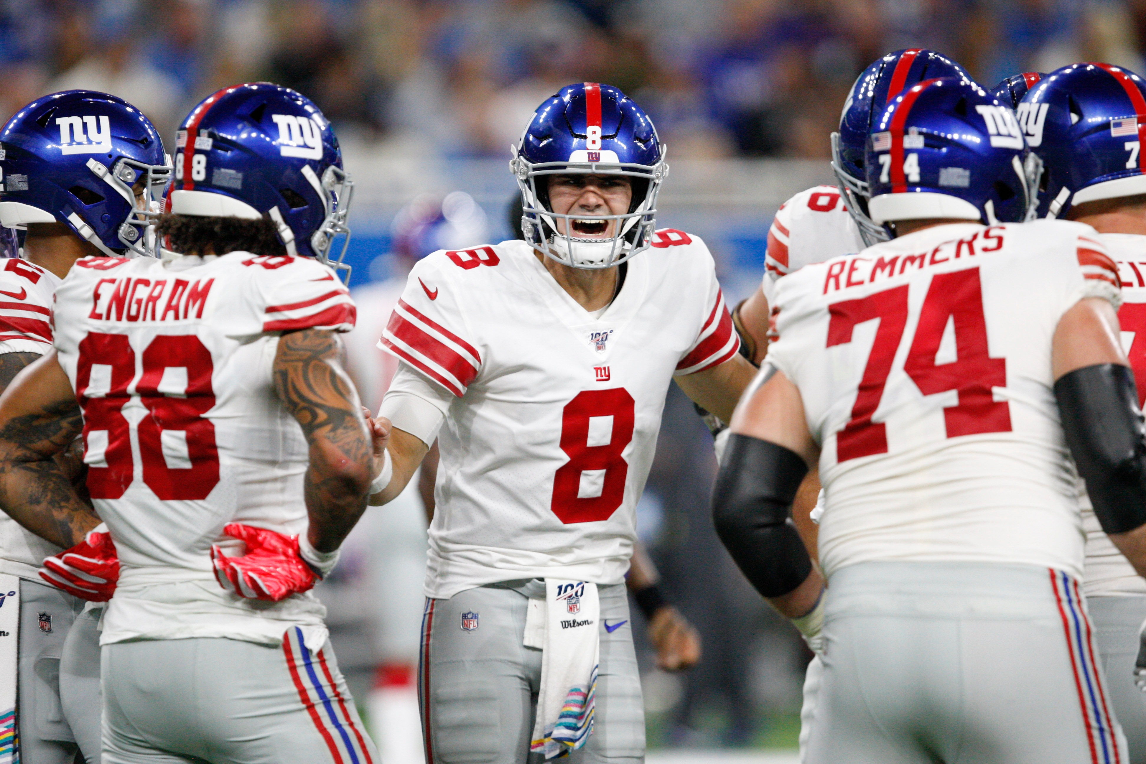 Oct 27, 2019; Detroit, MI, USA; New York Giants quarterback Daniel Jones (8) calls out a play to his team during the third quarter against the Detroit Lions at Ford Field. Mandatory Credit: Raj Mehta-USA TODAY Sportsundefined