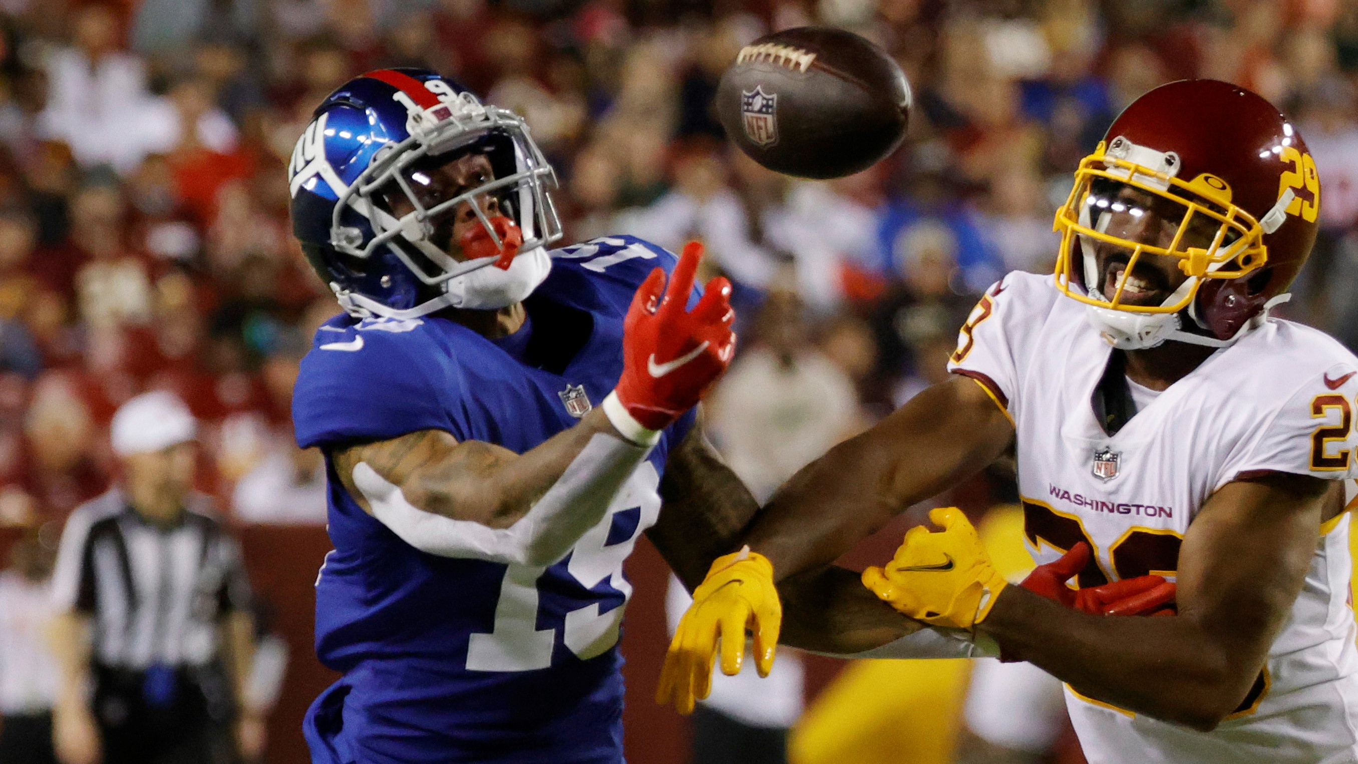Sep 16, 2021; Landover, Maryland, USA; New York Giants wide receiver Kenny Golladay (19) attempts to make a catch as Washington Football Team cornerback Kendall Fuller (29) defends in the third quarter at FedExField. Mandatory Credit: Geoff Burke-USA TODAY Sports / Geoff Burke-USA TODAY Sports