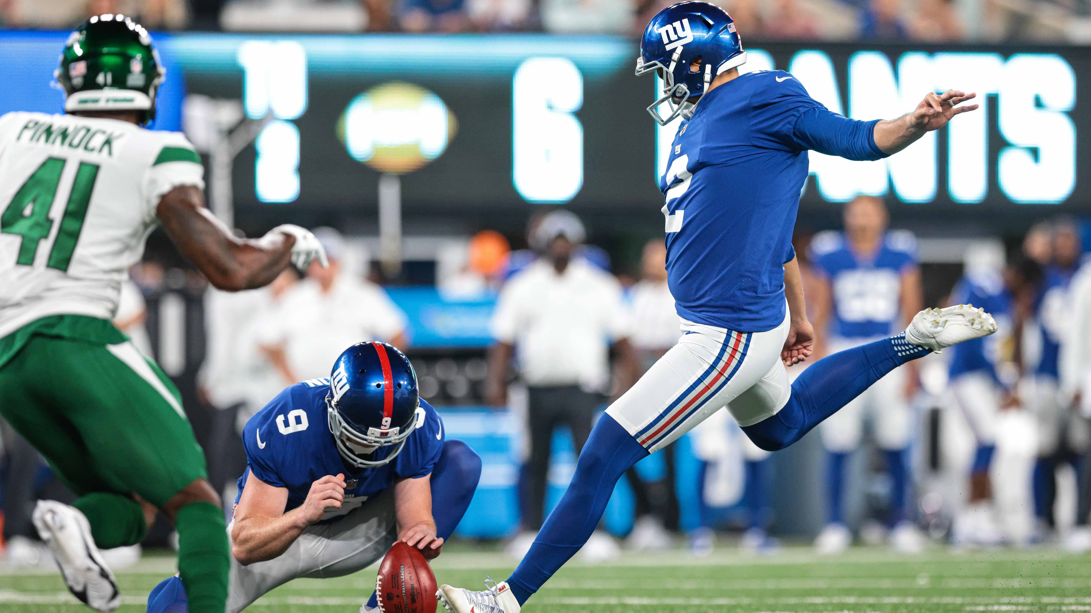 Aug 14, 2021; East Rutherford, New Jersey, USA; New York Giants punter Ryan Santoso (2) kicks an extra point as New York Giants punter Riley Dixon (9) holds and New York Jets cornerback Jason Pinnock (41) defends during the second half at MetLife Stadium. / Vincent Carchietta-USA TODAY Sports