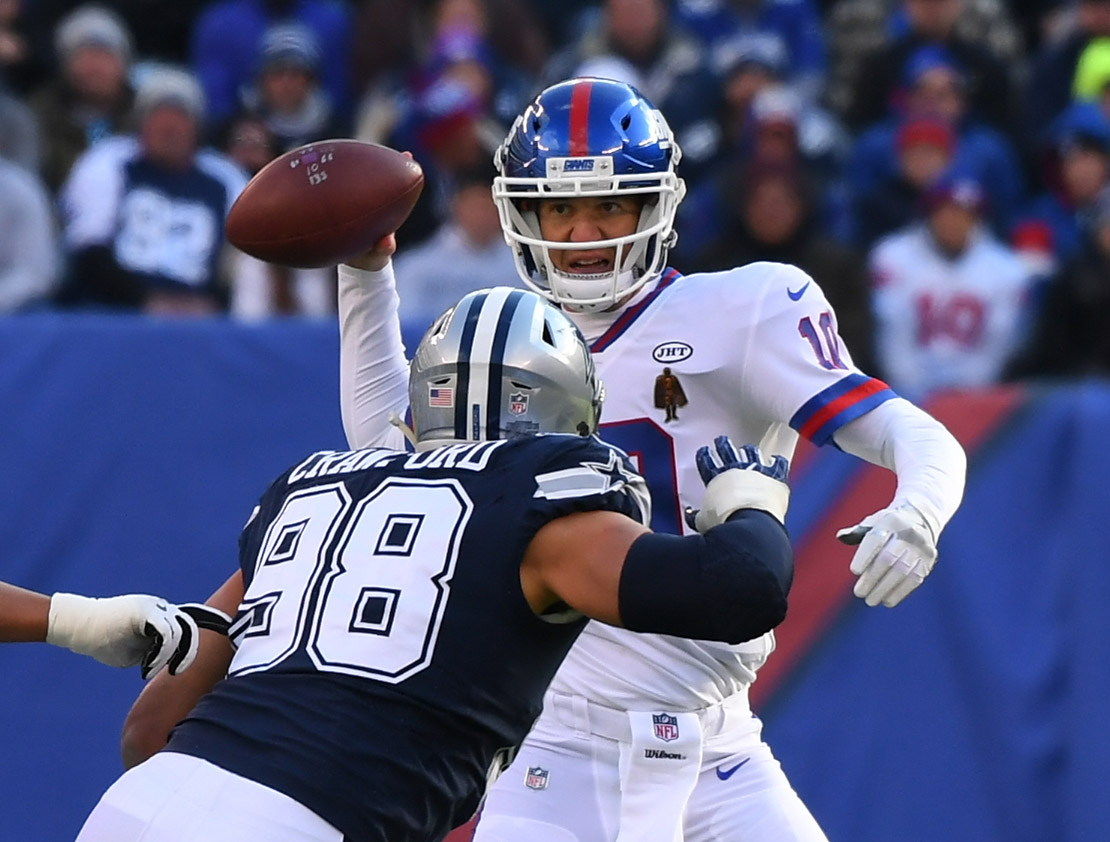New York Giants quarterback Eli Manning throws a pass against Dallas Cowboys defensive end Tyrone Crawford in the first half during a NFL football game at MetLife Stadium. / Robert Deutsch/USA TODAY Sports
