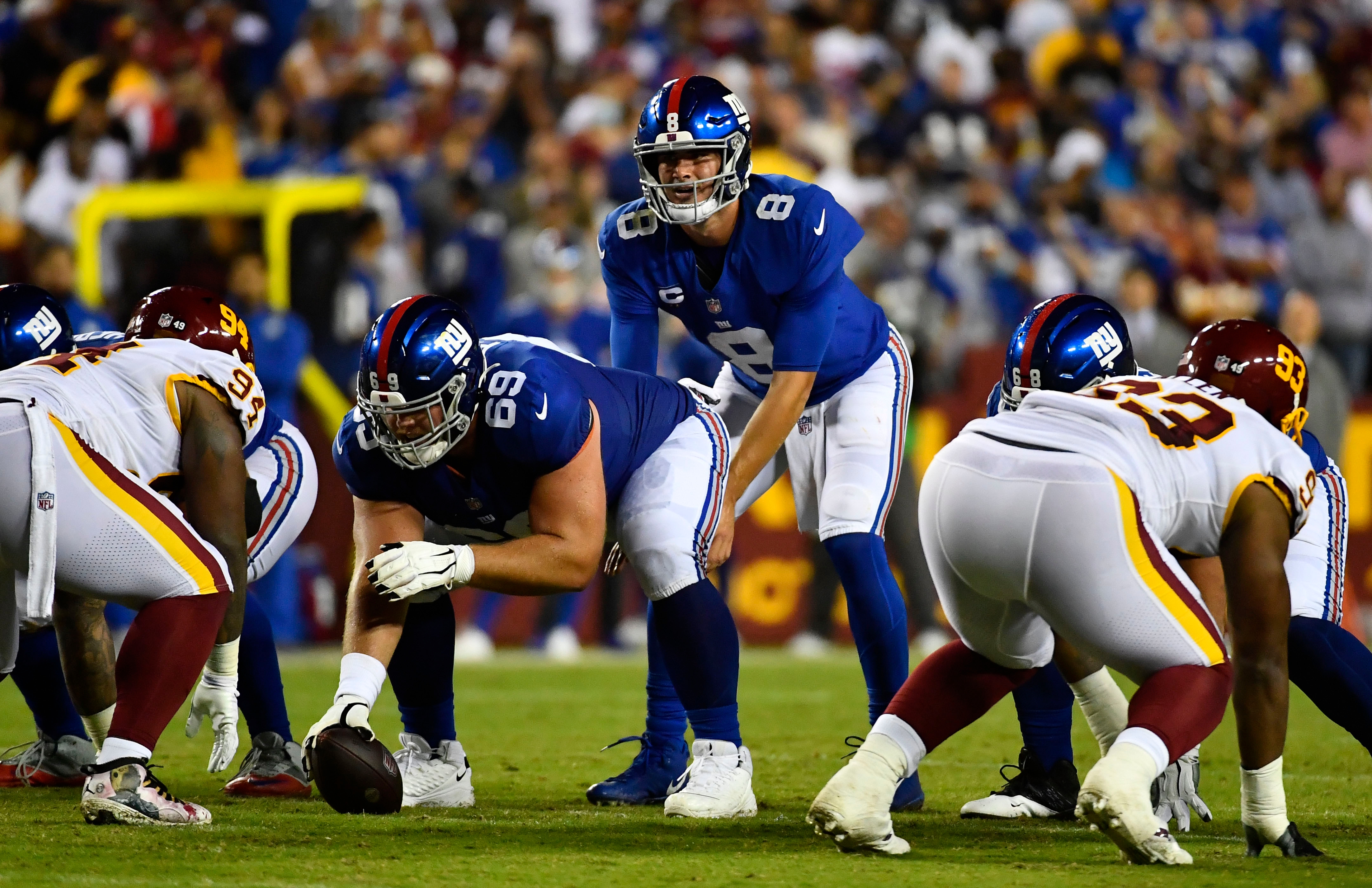 Giants' O-line deserves more credit for offensive successMore time for Jones and more holes for Barkley make everything flow10/7/2021, 10:03 PMRalph VacchianoNFL InsiderNew York Giants quarterback Daniel Jones (8) waits for the snap at the line of scrimmage against the Washington Football Team during the first half at FedExField. / Brad Mills - USA TODAY Sports