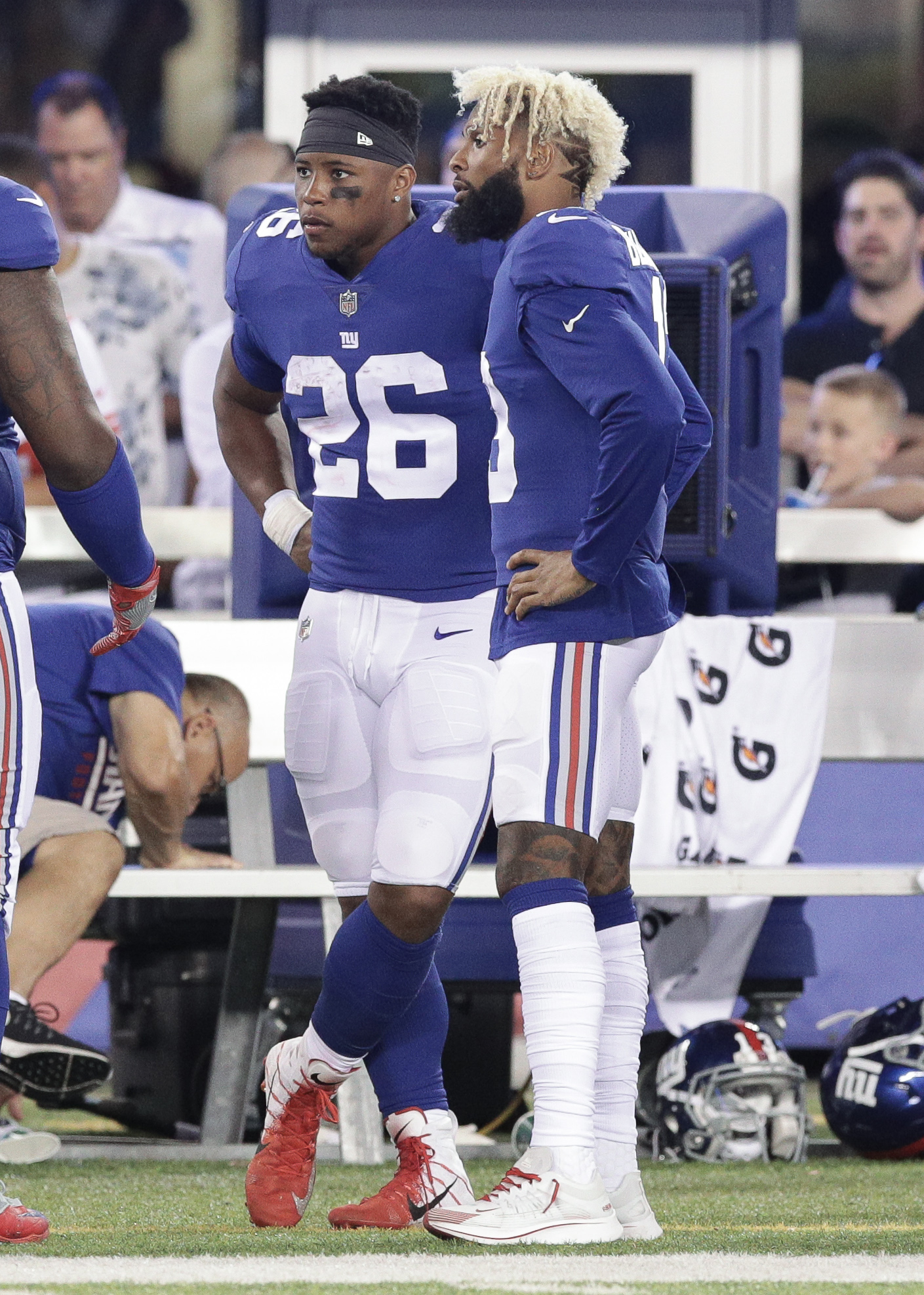Aug 9, 2018; East Rutherford, NJ, USA; New York Giants running back Saquon Barkley (26) talks with wide receiver Odell Beckham (13) during the first half at MetLife Stadium. Mandatory Credit: Vincent Carchietta-USA TODAY Sports / Vincent Carchietta