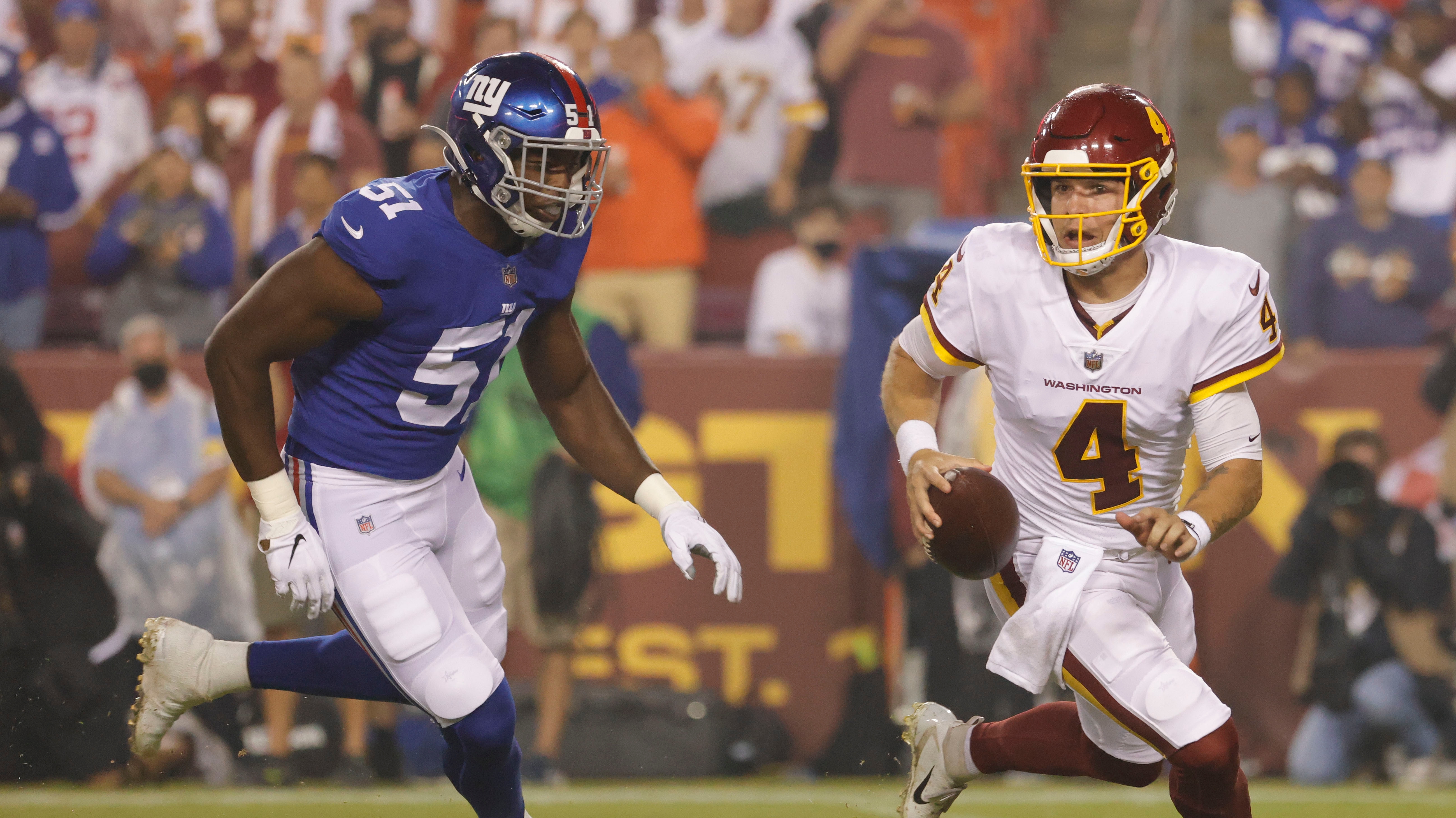 Giants OLB Azeez Ojulari already breaking franchise records to start rookie seasonIn his first three games, Ojulari has three sacks -- something Lawrence Taylor didn't even do9/28/2021, 3:46 PMScott ThompsonEditorial ProducerWashington Football Team quarterback Taylor Heinicke (4) is chased by New York Giants linebacker Azeez Ojulari (51) in the first quarter at FedExField. / Geoff Burke - USA TODAY Sports