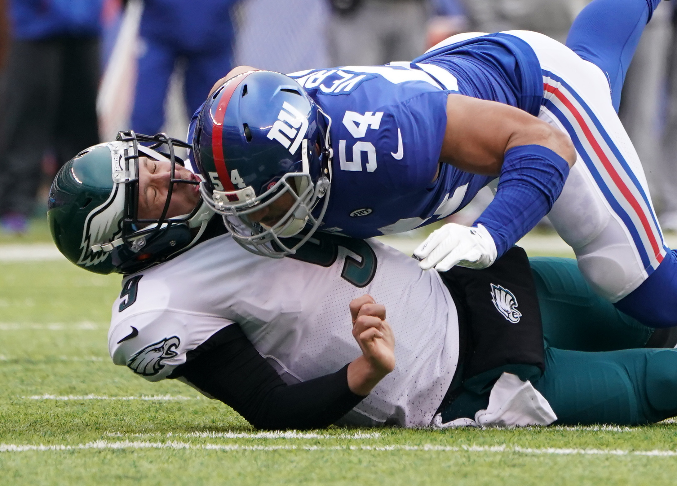 Philadelphia Eagles quarterback Nick Foles (9) is hit after the throw by New York Giants defensive end Olivier Vernon (54) in the first half at MetLife Stadium. Mandatory Credit: Robert Deutsch-USA TODAY Sports / Robert Deutsch