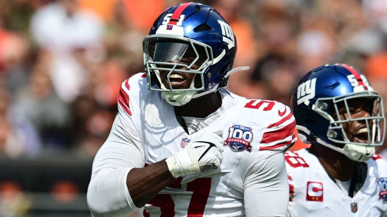 Sep 22, 2024; Cleveland, Ohio, USA; New York Giants linebacker Bobby Okereke (58) and New York Giants linebacker Azeez Ojulari (51) celebrate after a sack during the first quarter against the Cleveland Browns at Huntington Bank Field. / Ken Blaze-Imagn Images