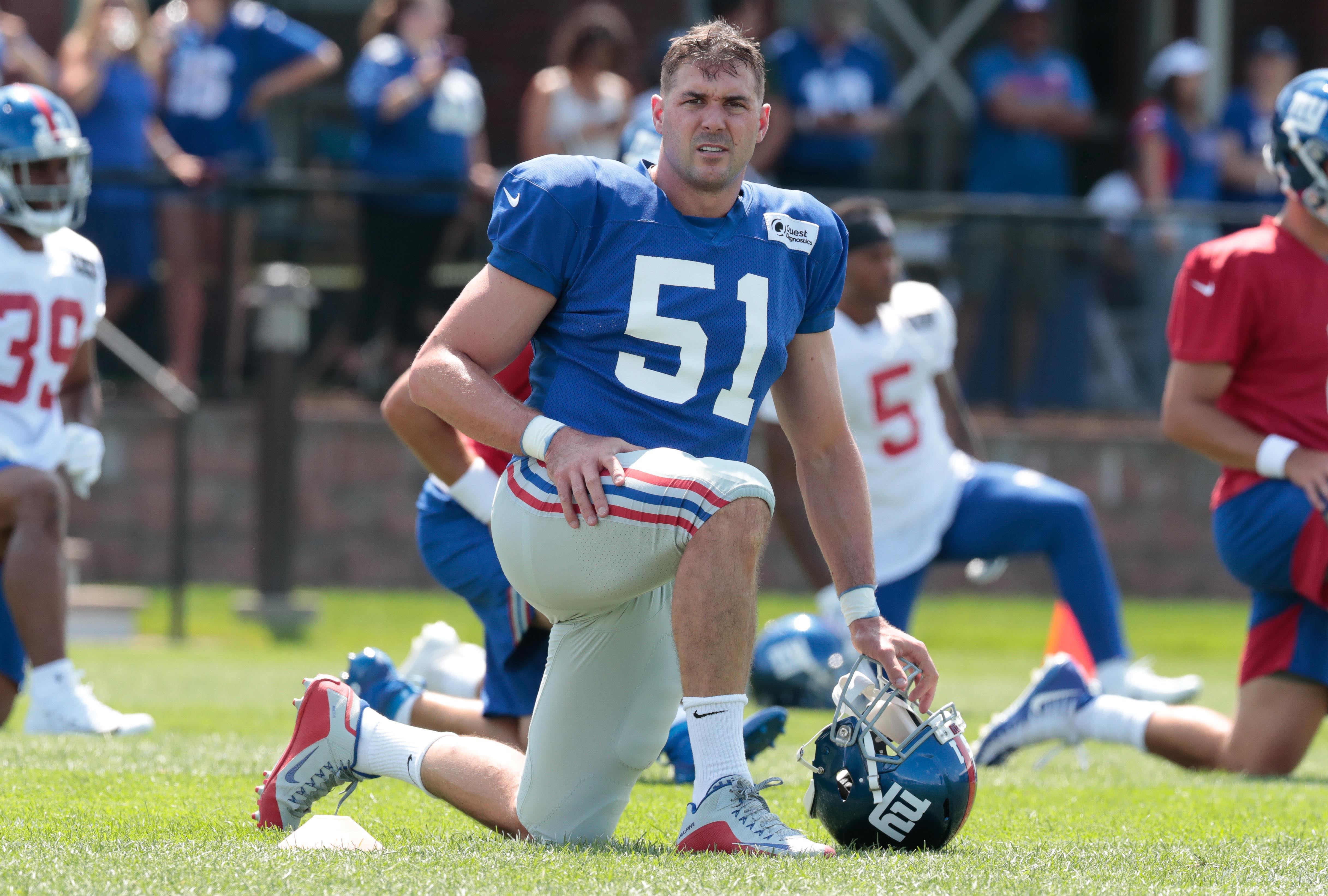 Jul 25, 2019; East Rutherford, NJ, USA; New York Giants long snapper Zak DeOssie (51) warms up during the first day of training camp at Quest Diagnostics Training Center. Mandatory Credit: Vincent Carchietta-USA TODAY Sports / Vincent Carchietta