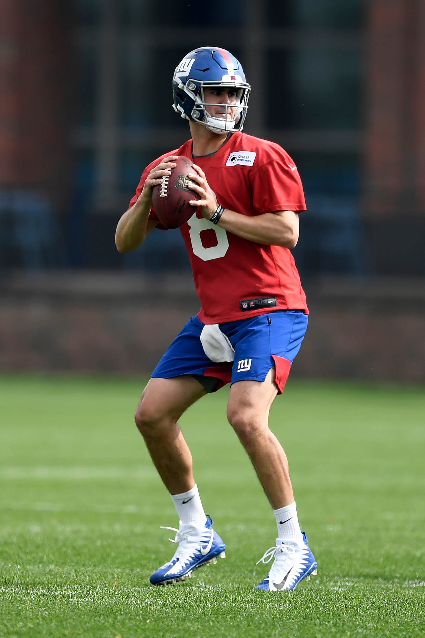 New York Giants quarterback draft pick Daniel Jones looks to pass during a drill during rookie minicamp at Quest Diagnostics Training Center. / Sarah Stier/USA TODAY Sports