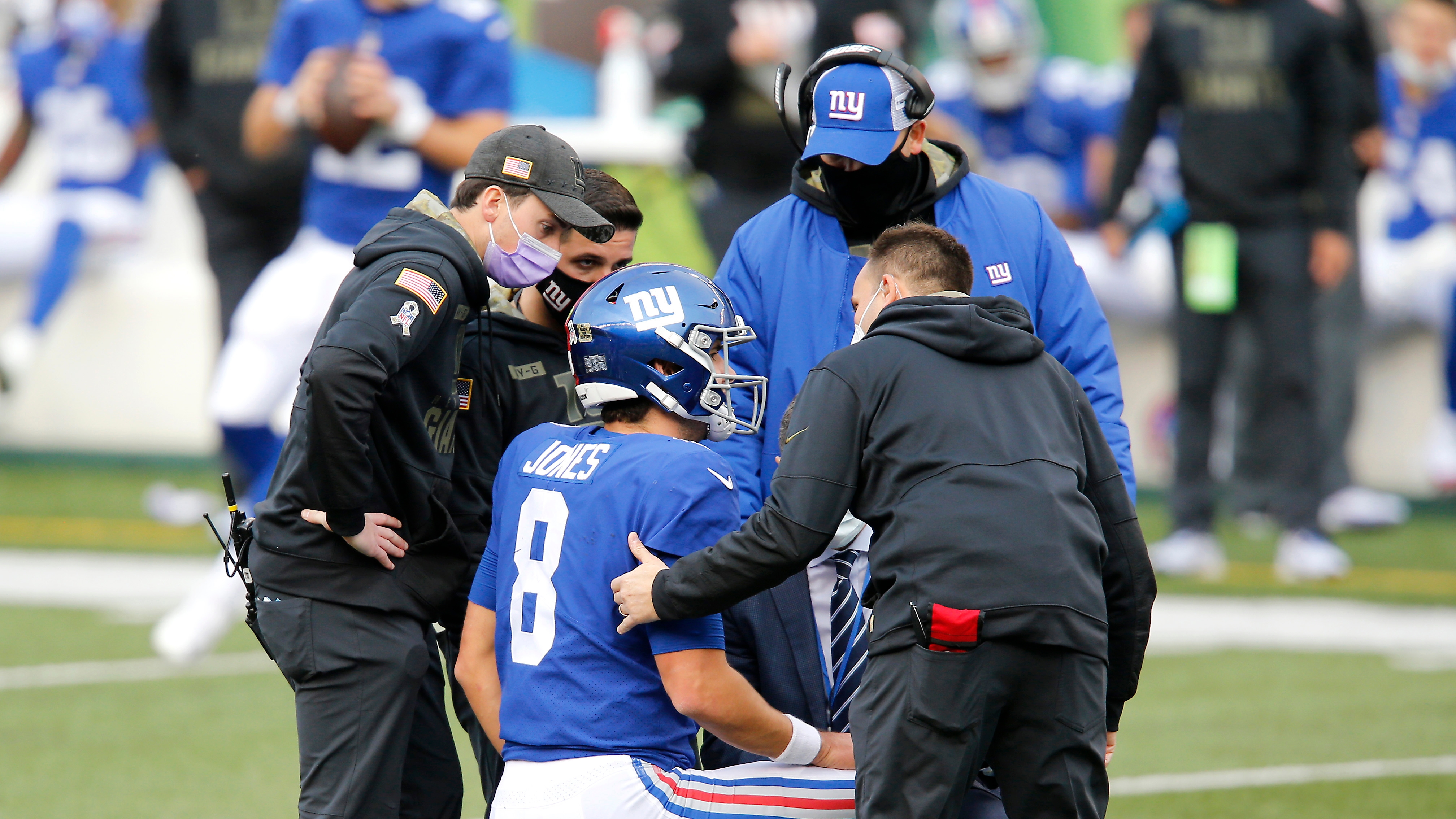 Giants QB Daniel Jones explains why he tried to keep playing after suffering hamstring injury vs. BengalsJones will receive an MRI on Monday11/29/2020, 7:54 PMScott ThompsonEditorial ProducerDaniel Jones gets looked at by coach Joe Judge and trainers / USA TODAY
