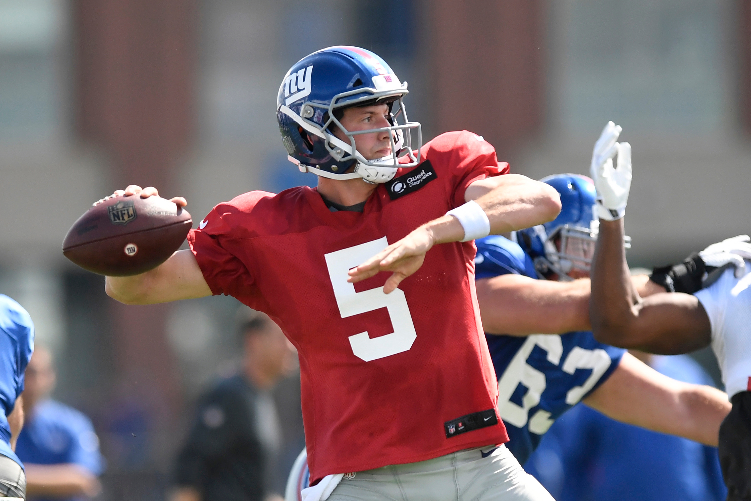 Aug 1, 2018; East Rutherford, NJ, USA; New York Giants quarterback Davis Webb (5) throws the ball during training camp in East Rutherford. Mandatory Credit: Danielle Parhizkaran/NorthJersey.com via USA TODAY NETWORK / Danielle Parhizkaran
