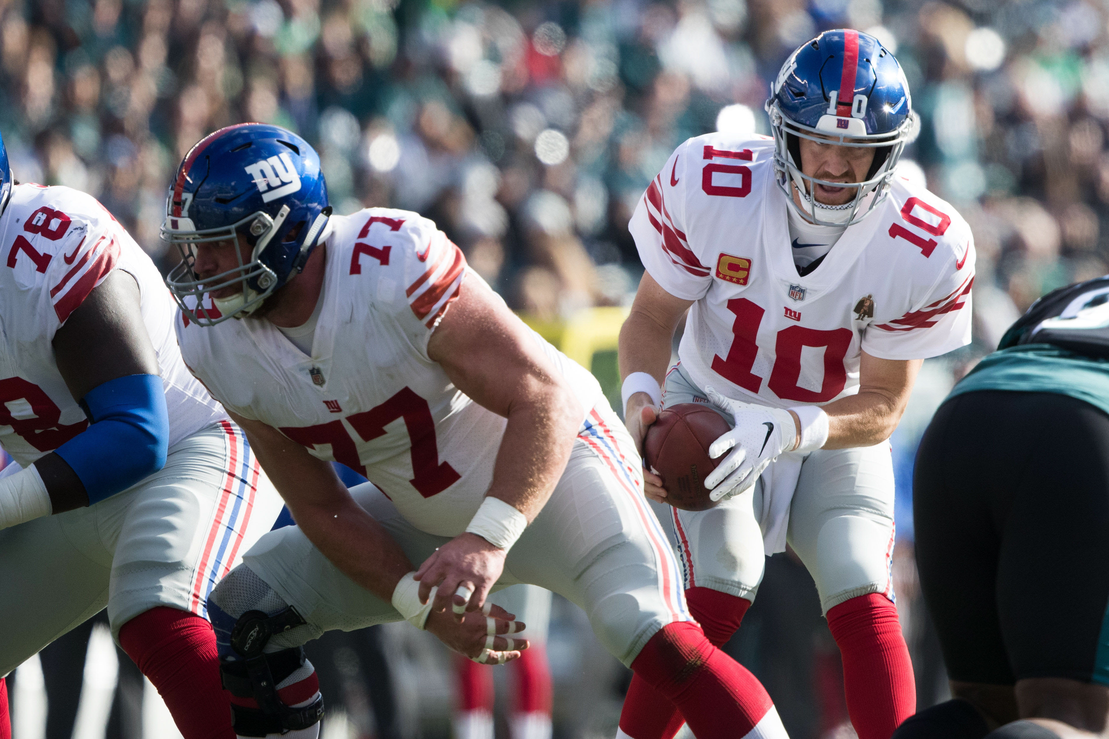 Nov 25, 2018; Philadelphia, PA, USA; New York Giants quarterback Eli Manning (10) and center Spencer Pulley (77) in action against the Philadelphia Eagles during the first quarter at Lincoln Financial Field. Mandatory Credit: Bill Streicher-USA TODAY Sports / Bill Streicher