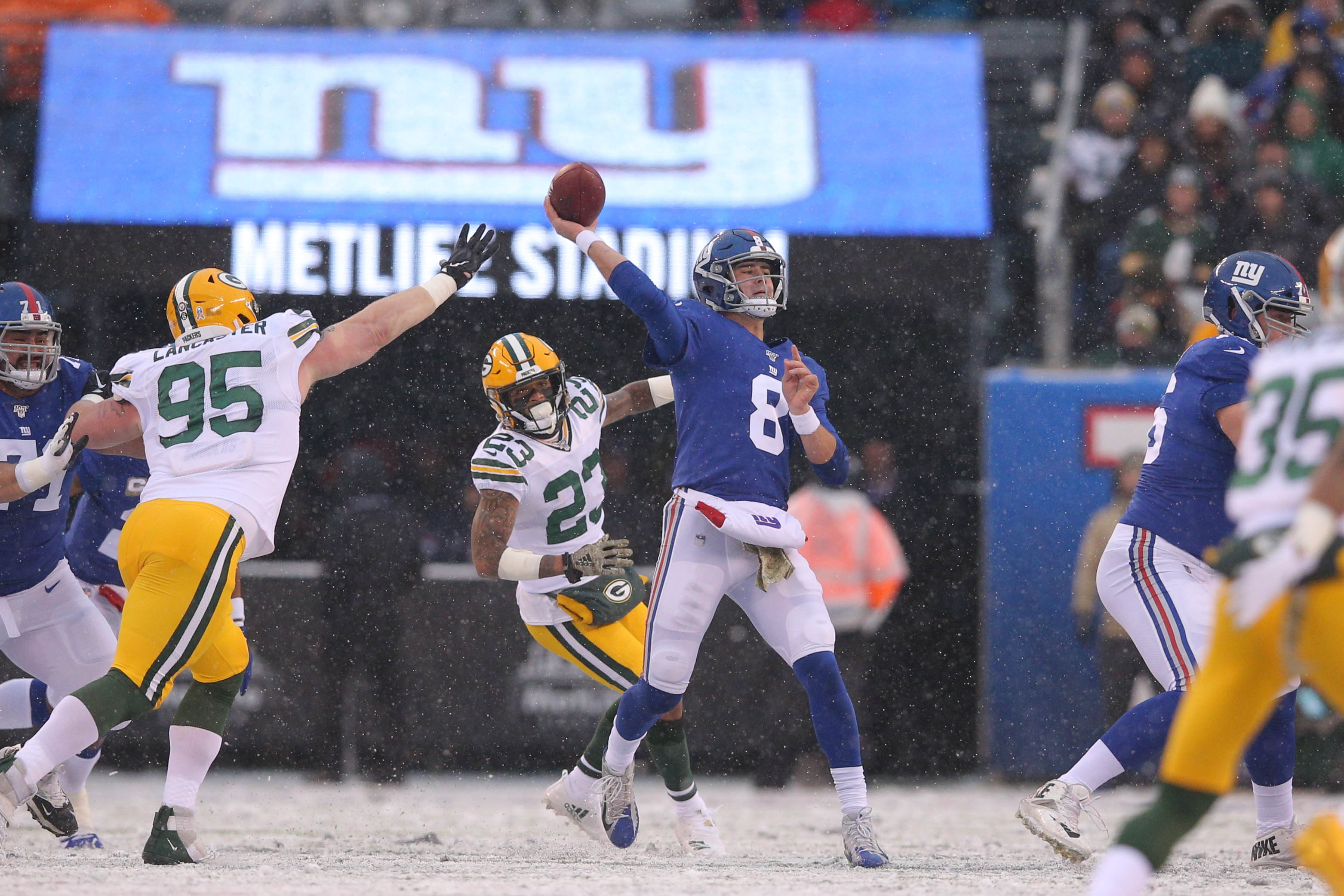 Dec 1, 2019; East Rutherford, NJ, USA; New York Giants quarterback Daniel Jones (8) throws a pass against Green Bay Packers cornerback Jaire Alexander (23) during the second quarter at MetLife Stadium. Mandatory Credit: Brad Penner-USA TODAY Sports / Brad Penner