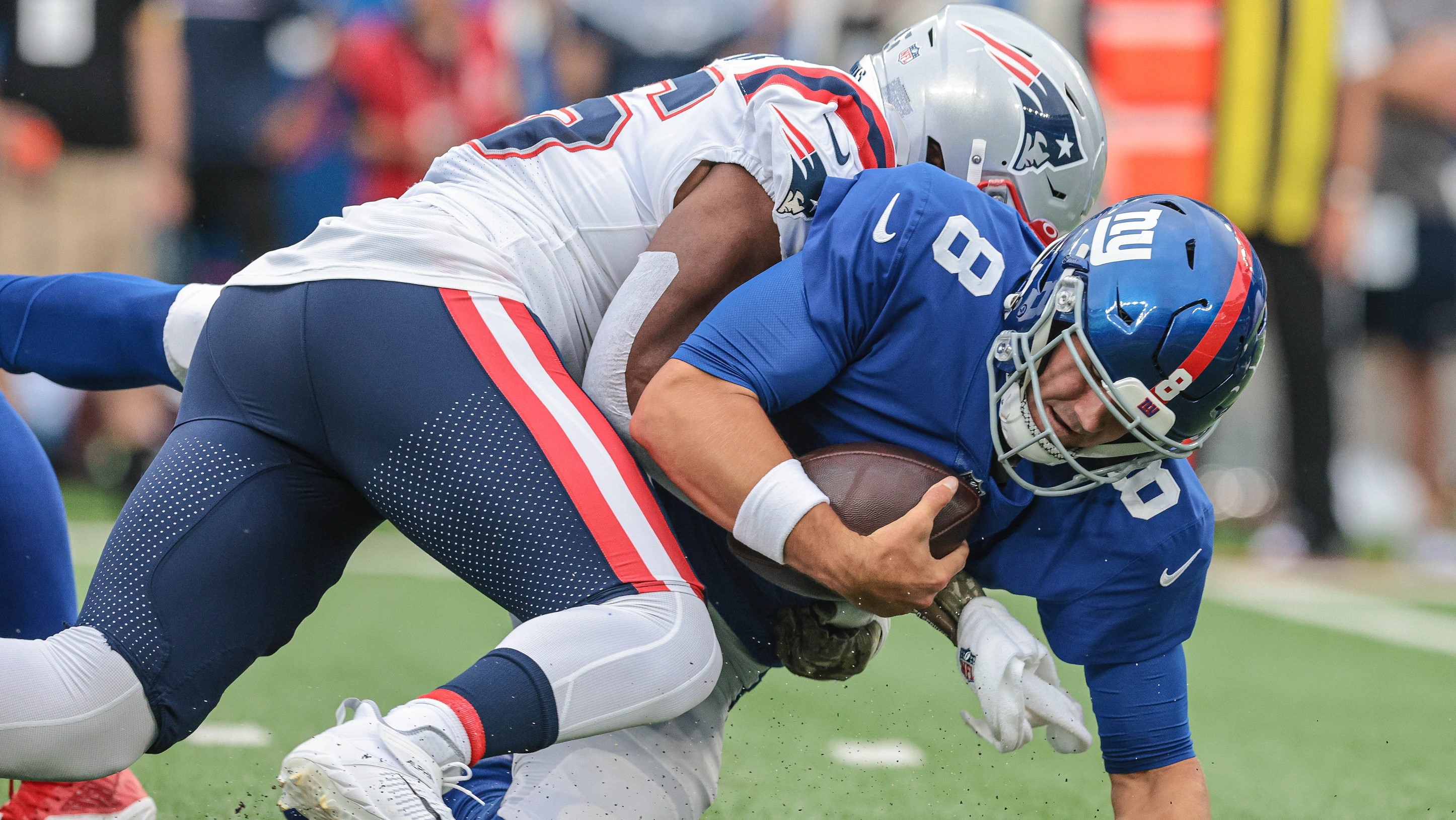 Giants takeaways from Sunday's loss to Patriots, including offensive line's rough night protecting Daniel JonesJones was 17-of-22 for 135 yards with one touchdown and one interception in the 22-20 loss8/30/2021, 1:05 AMRalph VacchianoNFL InsiderAug 29, 2021; East Rutherford, New Jersey, USA; New York Giants inside linebacker Blake Martinez (54) celebrate his turnover against the New England Patriots at MetLife Stadium. / Dennis Schneidler-USA TODAY Sports