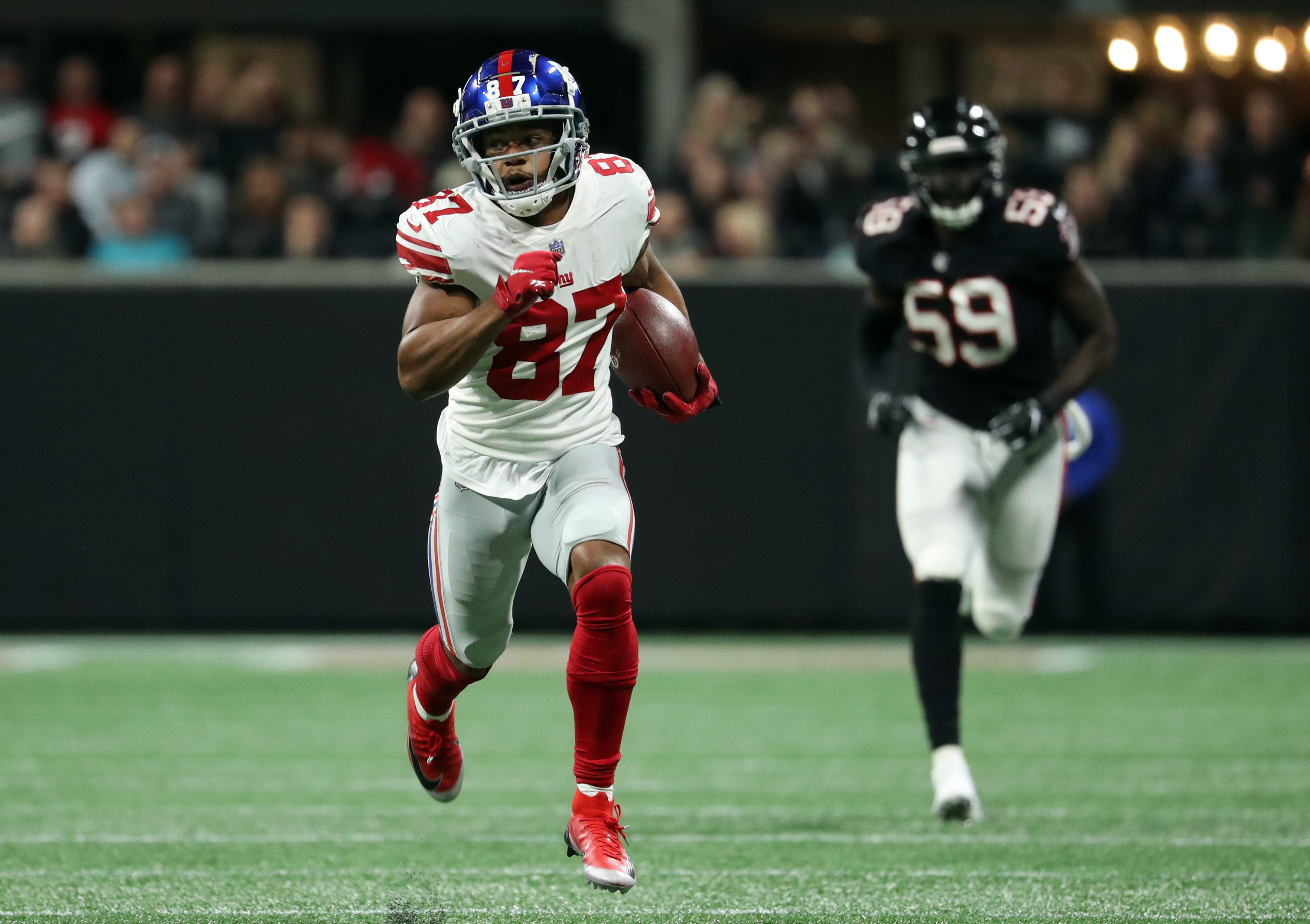 Oct 22, 2018; Atlanta, GA, USA; New York Giants wide receiver Sterling Shepard (87) runs after a catch in the third quarter against the Atlanta Falcons at Mercedes-Benz Stadium. Mandatory Credit: Jason Getz-USA TODAY Sports / Jason Getz