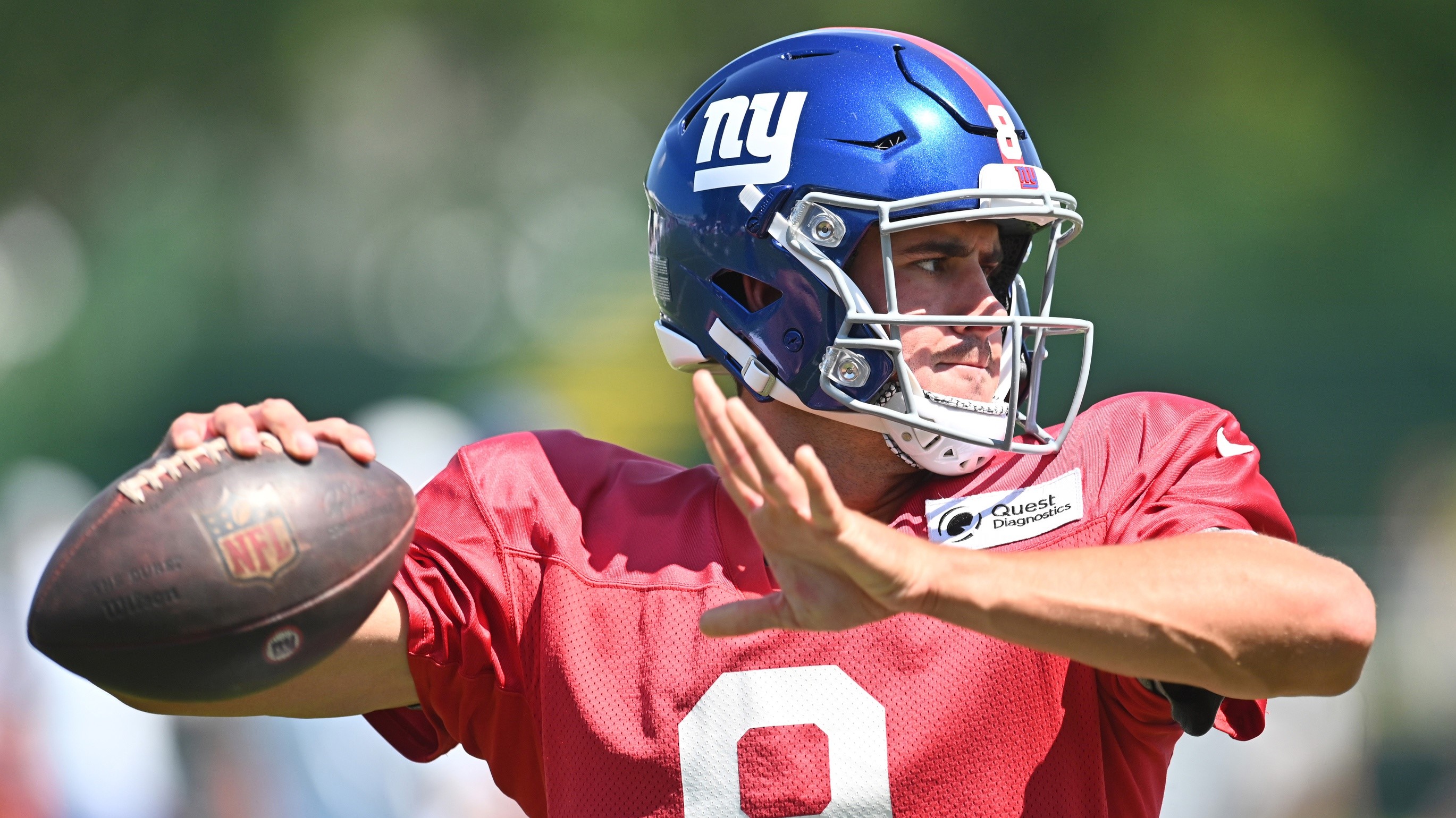 New York Giants quarterback Daniel Jones (8) throws a pass during a joint practice with the Cleveland Browns at CrossCountry Mortgage Campus. / Ken Blaze-USA TODAY Sports