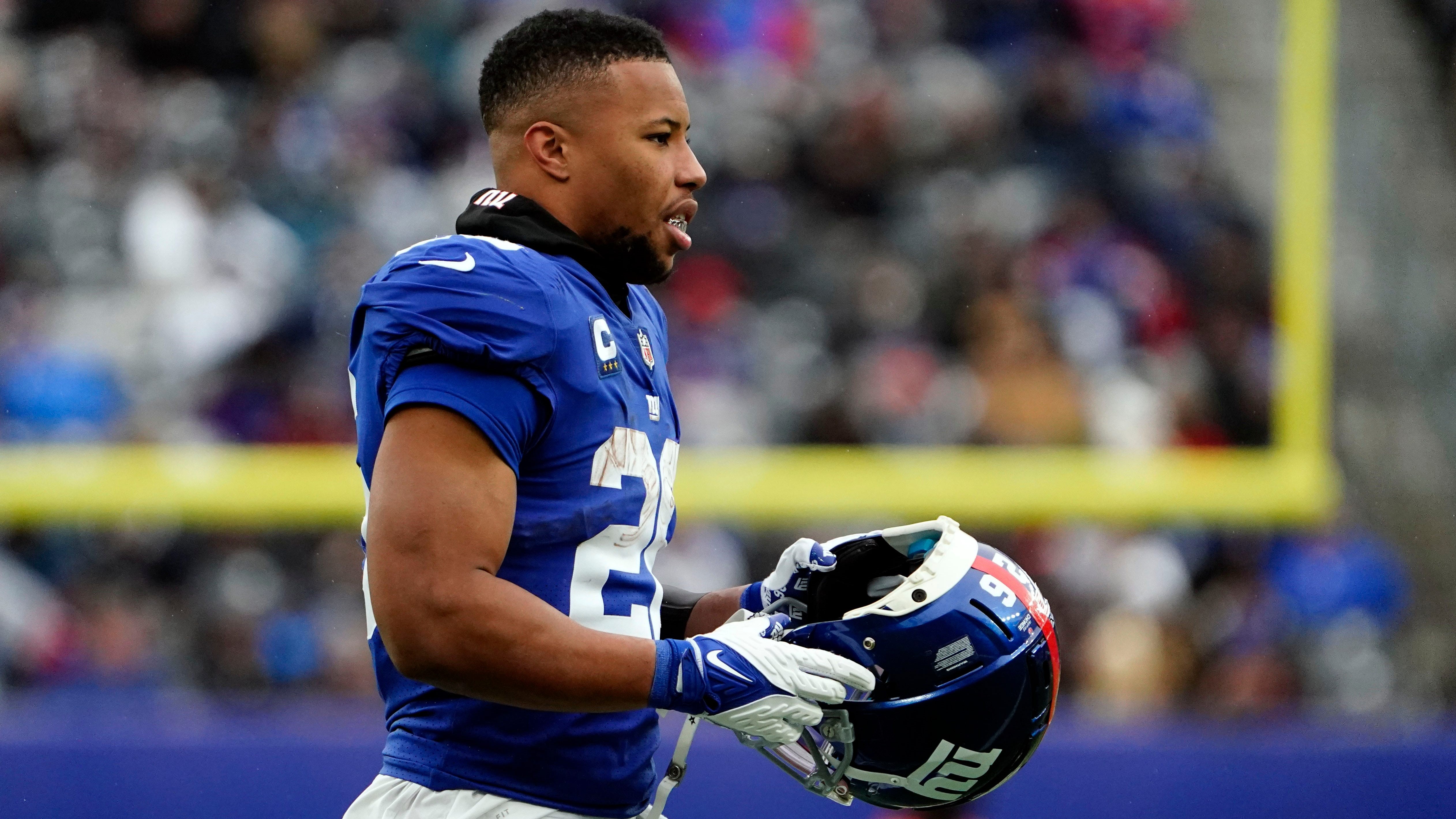 New York Giants running back Saquon Barkley (26) walks onto the field in the second half. The Giants lose to Washington, 22-7, at MetLife Stadium on Sunday, Jan. 9, 2022. / Danielle Parhizkaran/NorthJersey.com-Imagn Content Services, LLC
