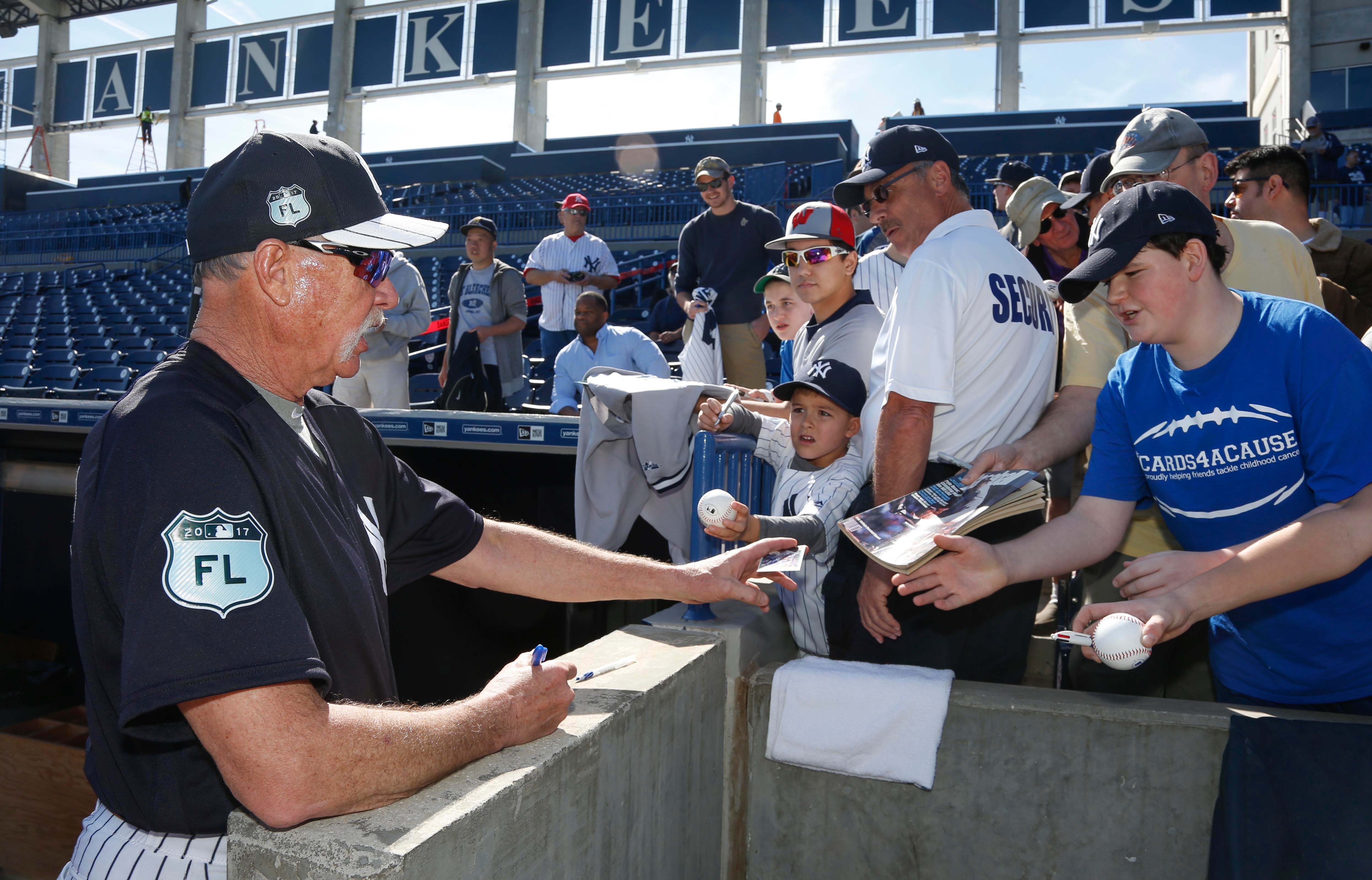New York Yankees instructor Goose Gossage signs autographs during MLB spring training workouts at George M. Steinbrenner Field. / Reinhold Matay/USA TODAY Sports