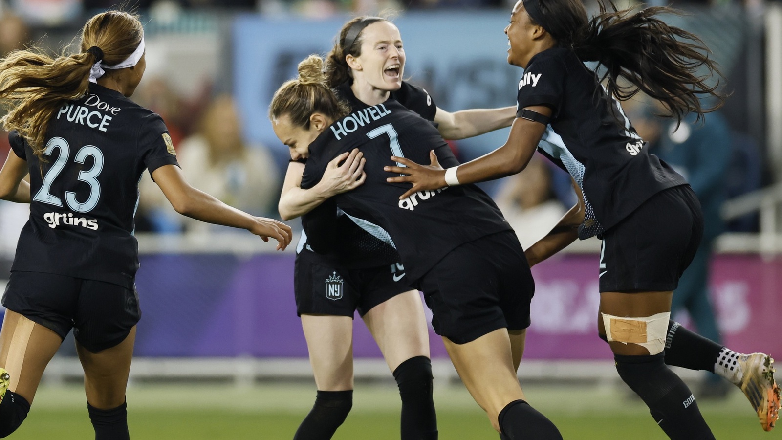 Gotham FC midfielder Rose Lavelle (16) celebrates with midfielder Jaelin Howell (7) and forward Margaret Purce (23) and midfielder Jaedyn Shaw (2) after scoring a goal against the Washington Spirit in the second half of the 2025 NWSL Championship at PayPal Park. / John Hefti-Imagn Images