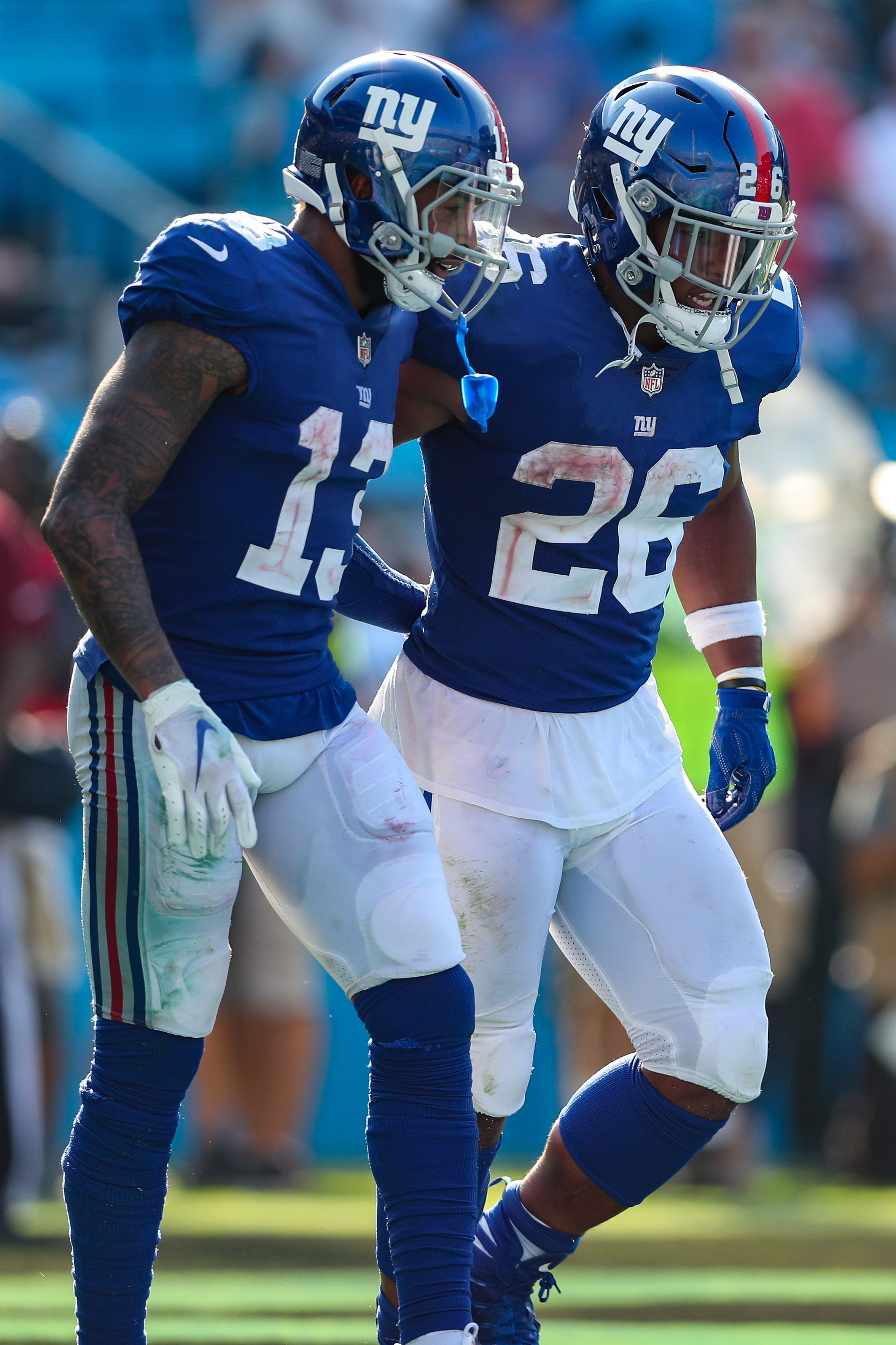 Oct 7, 2018; Charlotte, NC, USA; New York Giants wide receiver Odell Beckham (13) assists running back Saquon Barkley (26) against the Carolina Panthers during the second half at Bank of America Stadium. Mandatory Credit: Jim Dedmon-USA TODAY Sports / Jim Dedmon