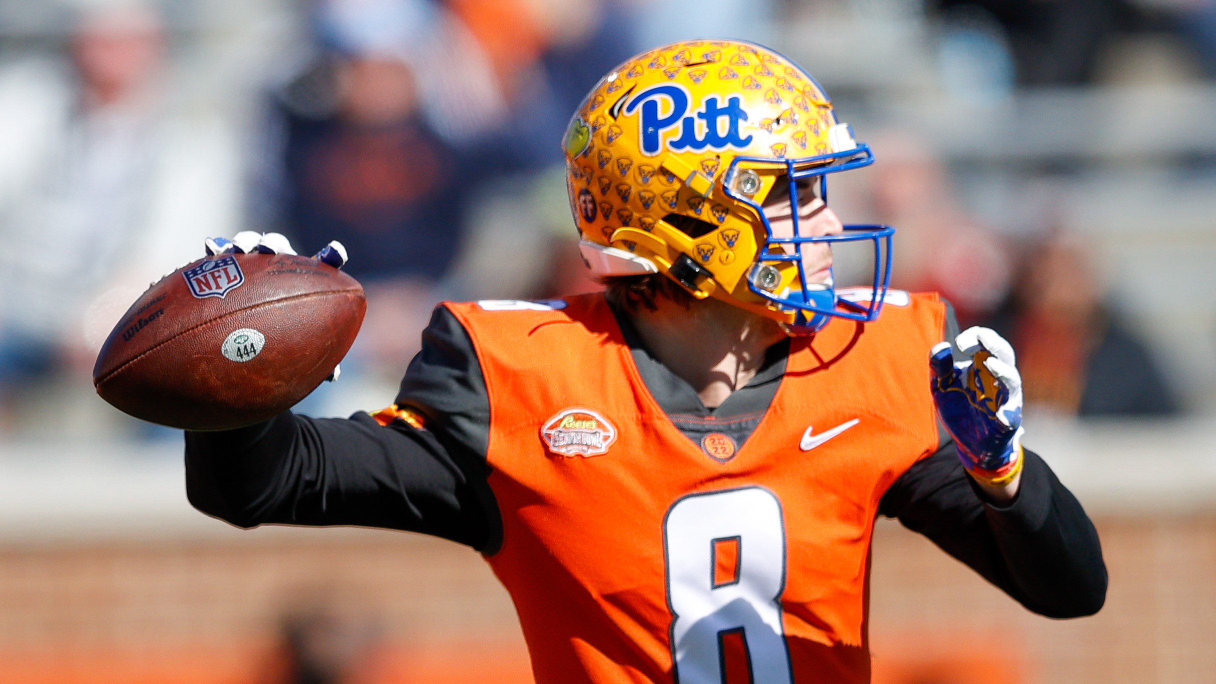 Feb 5, 2022; Mobile, AL, USA; -n8 National Squad quarterback Kenny Pickett of Pittsburgh (8) drops back to pass in the first quarter against the American squad at Hancock Whitney Stadium. Mandatory Credit: Nathan Ray Seebeck-USA TODAY Sports / Nathan Ray Seebeck-USA TODAY Sports