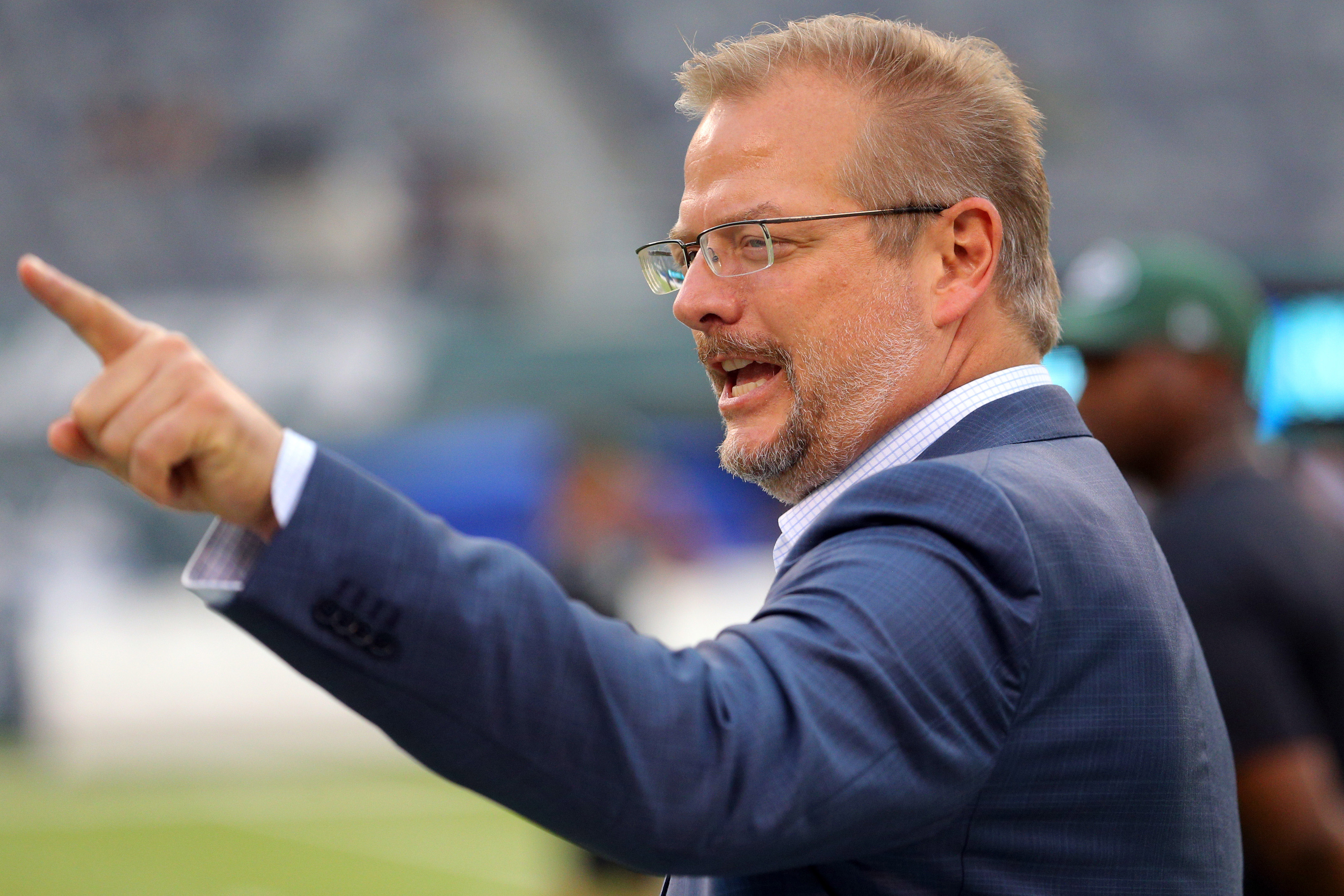 Aug 12, 2017; East Rutherford, NJ, USA; New York Jets general manager Mike Maccagnan reacts on the field before a preseason game against the Tennessee Titans at MetLife Stadium. Mandatory Credit: Brad Penner-USA TODAY Sports / Brad Penner