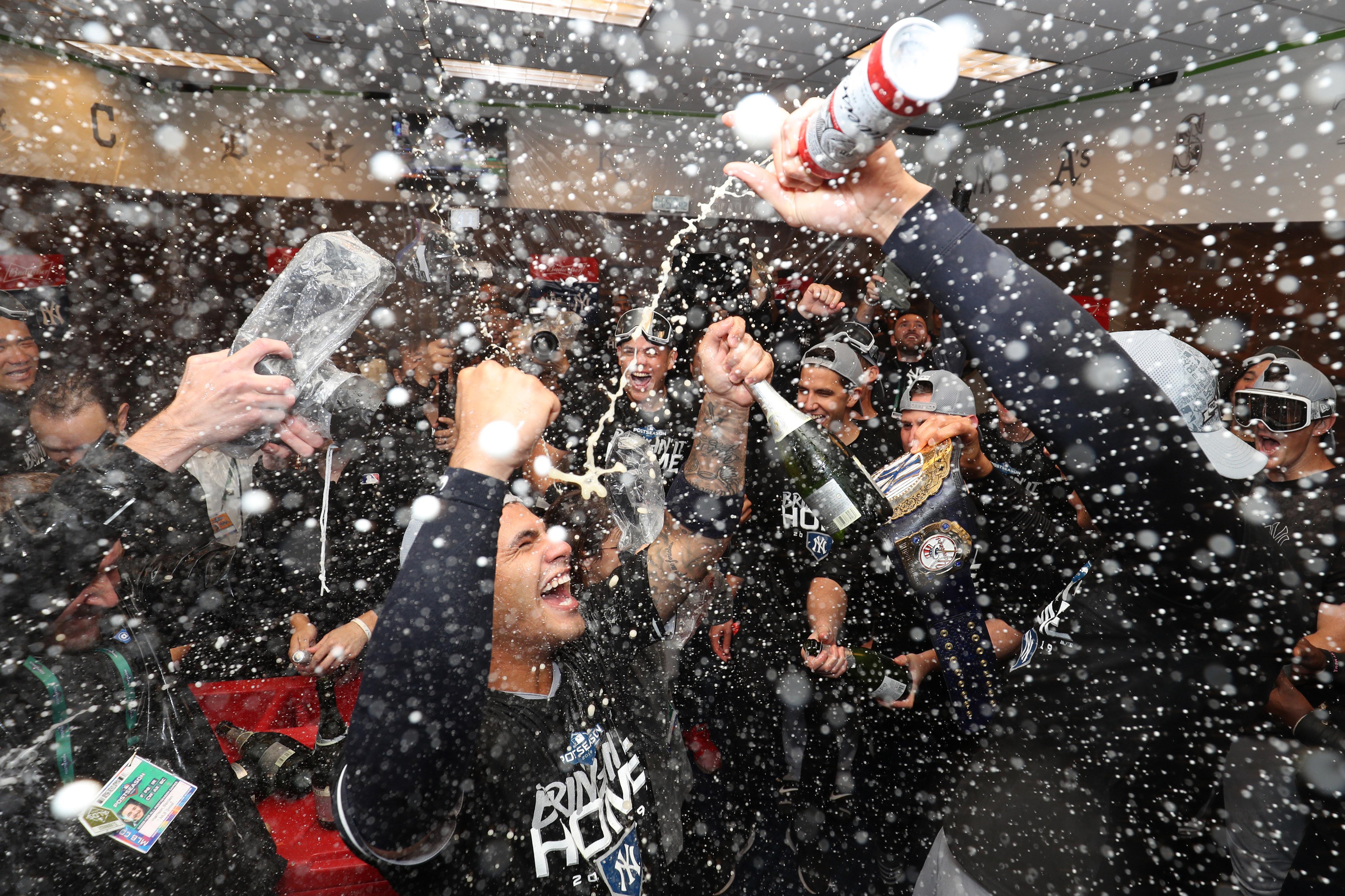 Oct 7, 2019; Minneapolis, MN, USA; The New York Yankees celebrate their victory in the locker room after defeating the Minnesota Twins in game three of the 2019 ALDS playoff baseball series at Target Field. Mandatory Credit: Jesse Johnson-USA TODAY Sports / Jesse Johnson