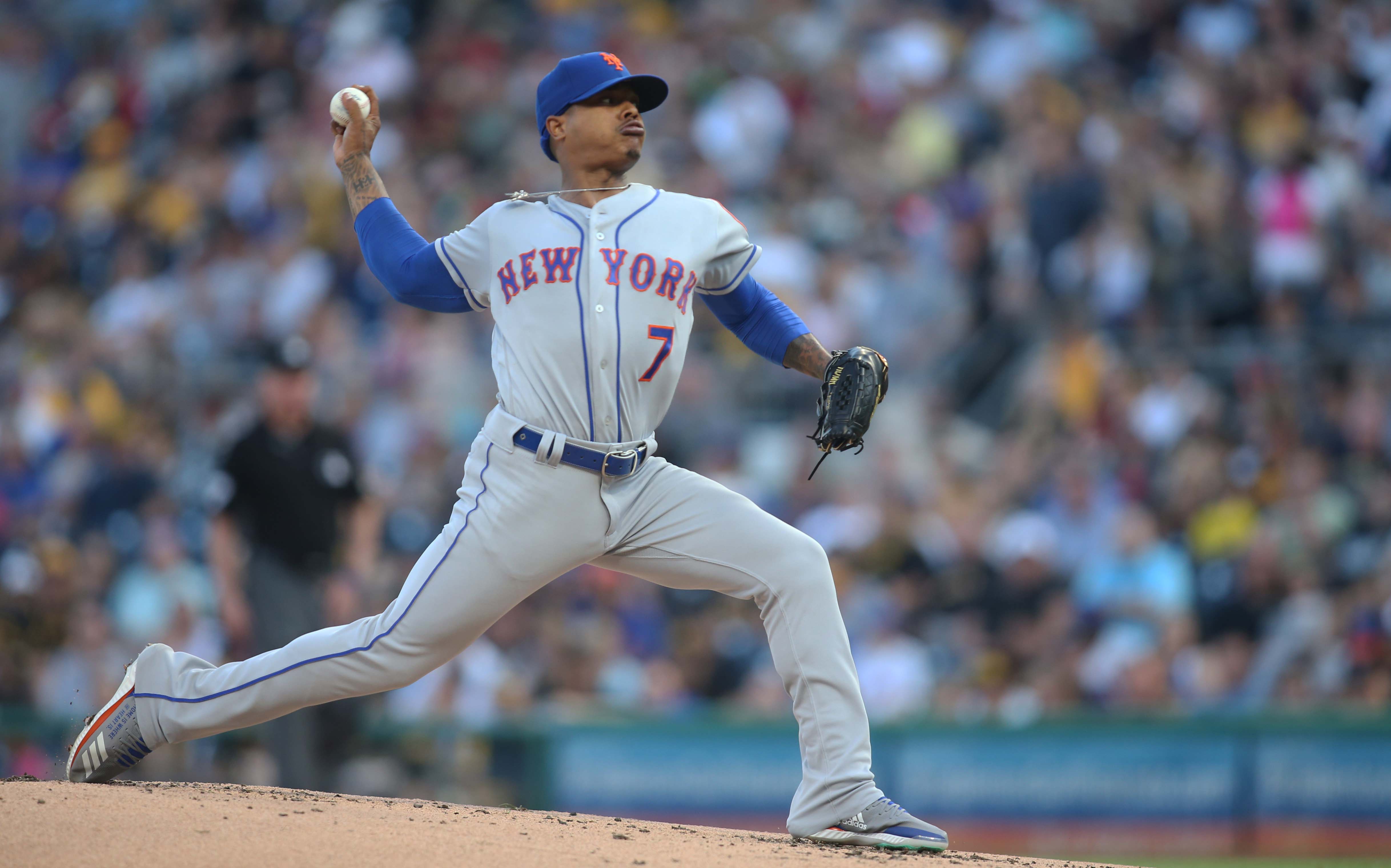 Aug 3, 2019; Pittsburgh, PA, USA; New York Mets starting pitcher Marcus Stroman (7) delivers a pitch against the Pittsburgh Pirates during the first inning at PNC Park. Mandatory Credit: Charles LeClaire-USA TODAY Sports / Charles LeClaire