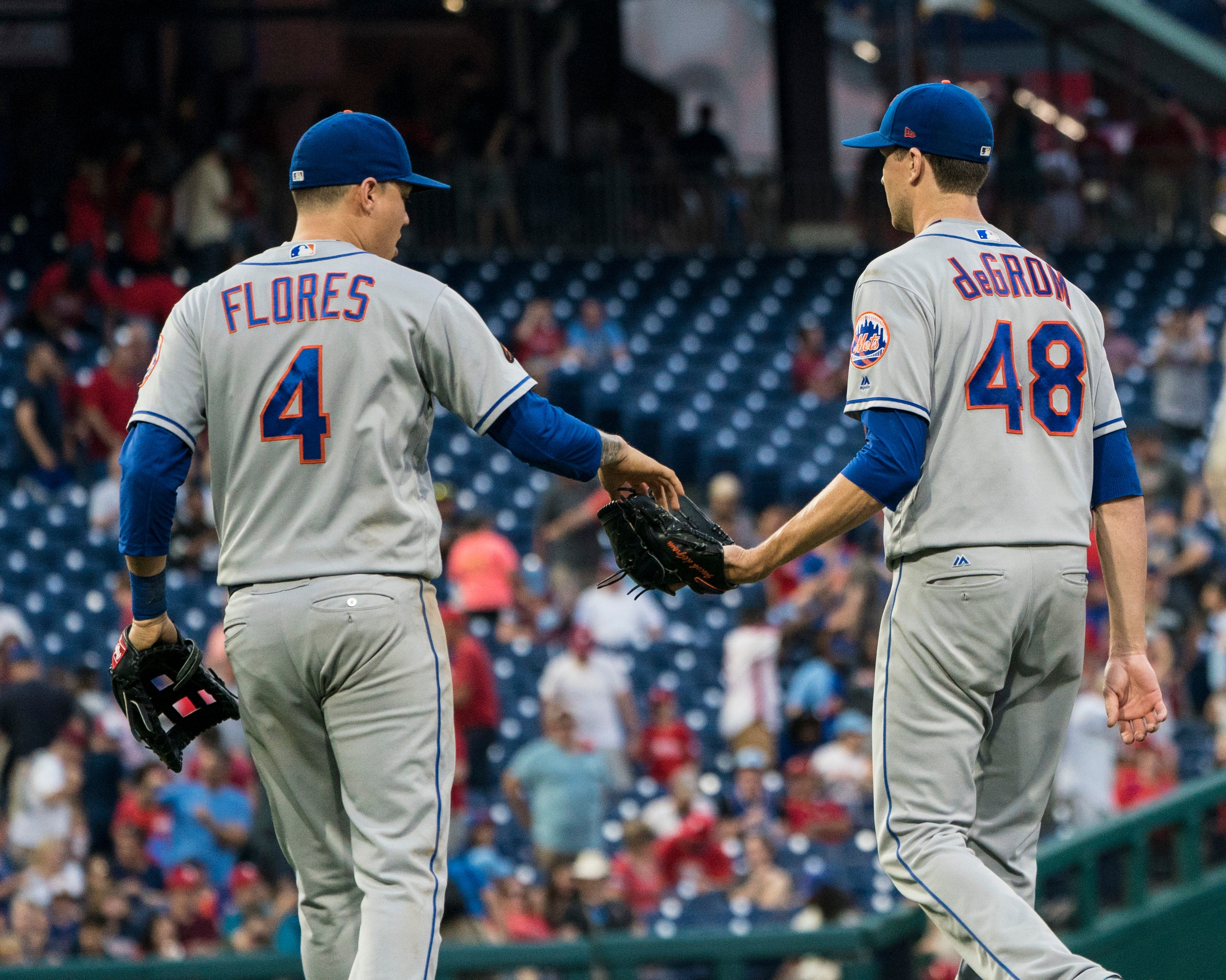 Aug 18, 2018; Philadelphia, PA, USA; New York Mets first baseman Wilmer Flores (4) puts the ball in New York Mets pitcher Jacob deGrom (48) glove after the last out in the ninth inning of the game at Citizens Bank Park. Mandatory Credit: Gregory J. Fisher-USA TODAY Sports / Gregory Fisher