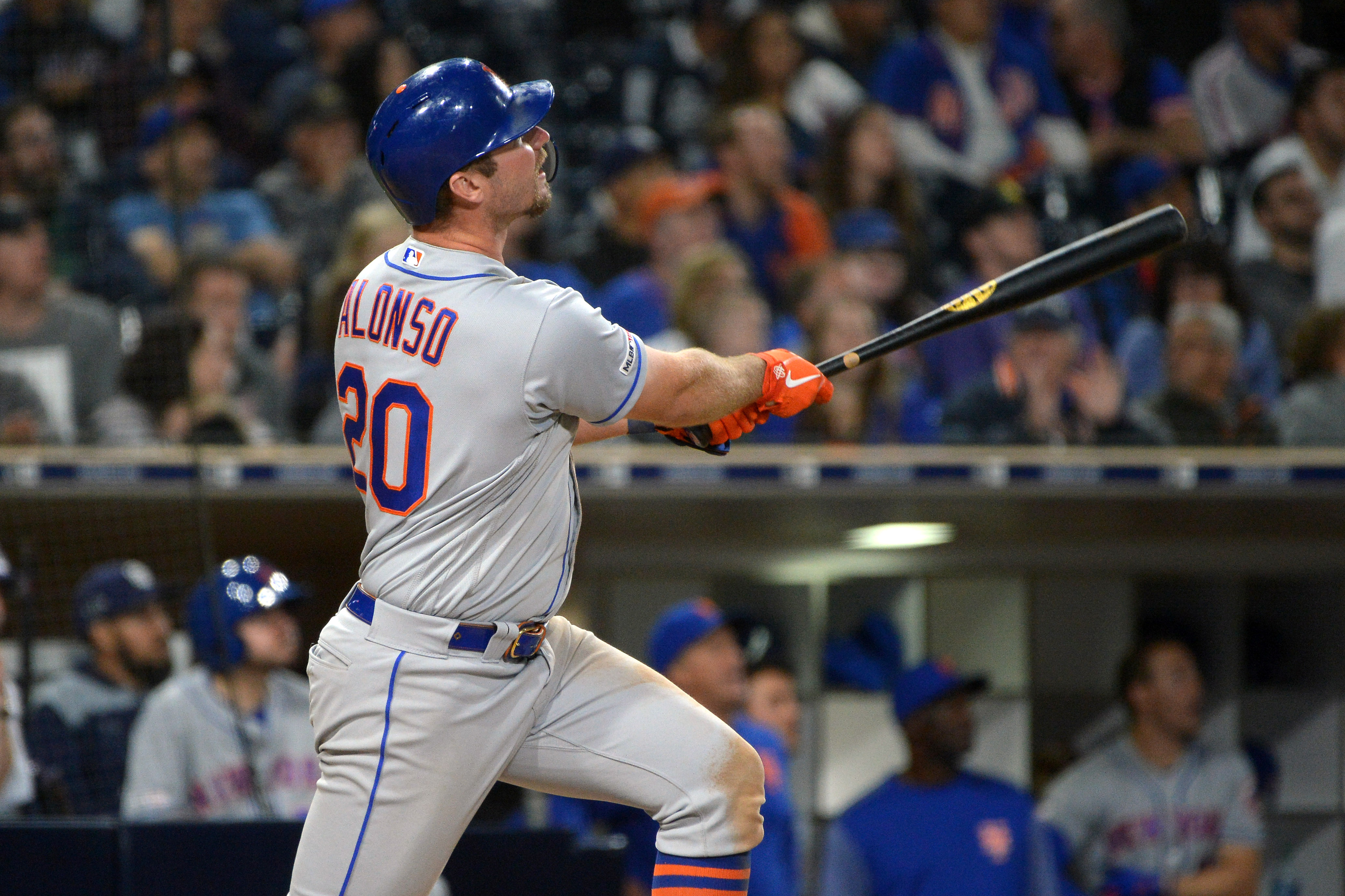 May 7, 2019; San Diego, CA, USA; New York Mets first baseman Pete Alonso (20) hits a two run home run during the ninth inning against the San Diego Padres at Petco Park. Mandatory Credit: Jake Roth-USA TODAY Sports / Jake Roth