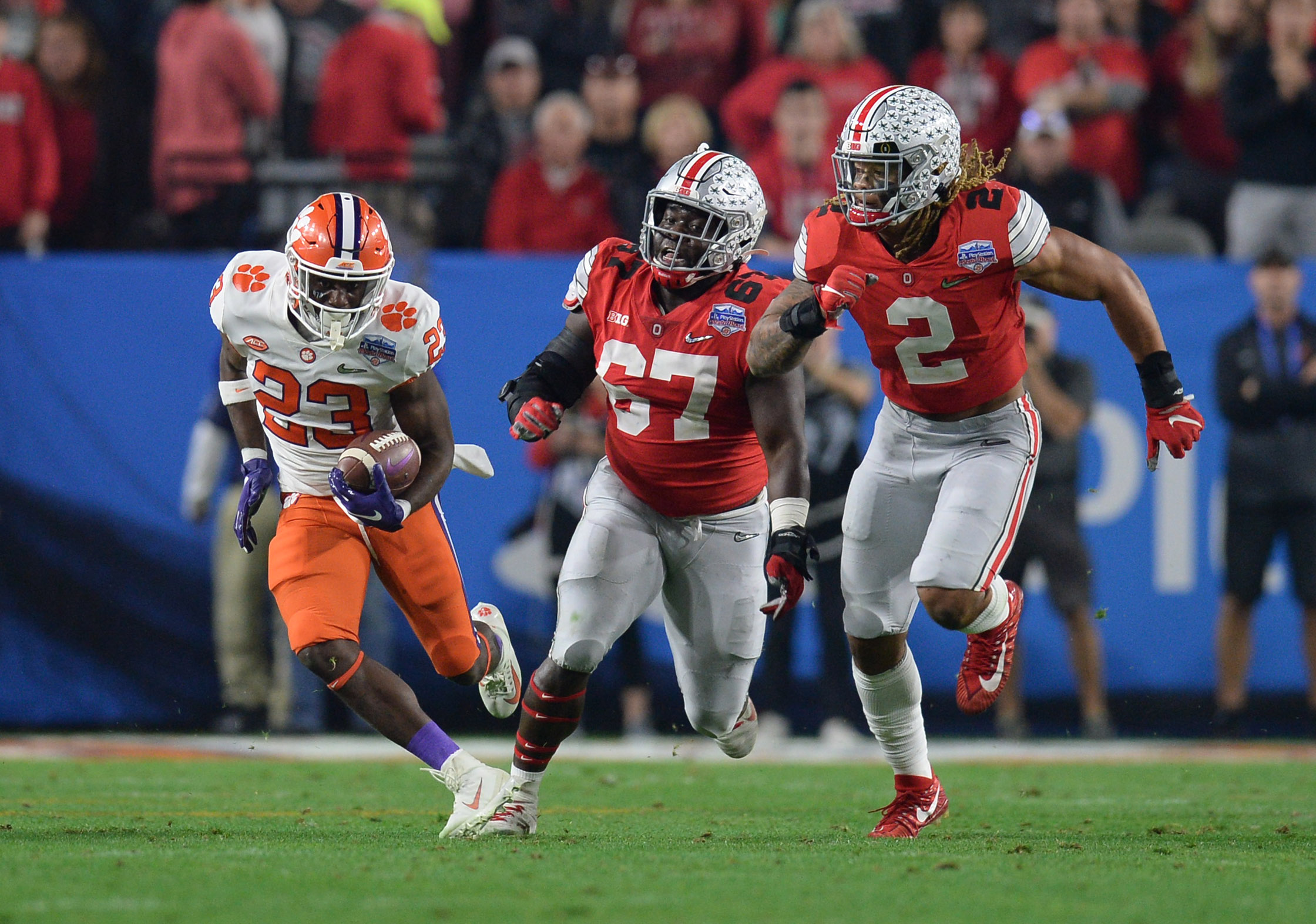 Dec 28, 2019; Glendale, AZ, USA; Clemson Tigers running back Lyn-J Dixon (23) runs the ball against Ohio State Buckeyes defensive end Chase Young (2) and defensive lineman Robert Landers (67) during the third quarter in the 2019 Fiesta Bowl college football playoff semifinal game at State Farm Stadium. Mandatory Credit: Joe Camporeale-USA TODAY Sports / Joe Camporeale