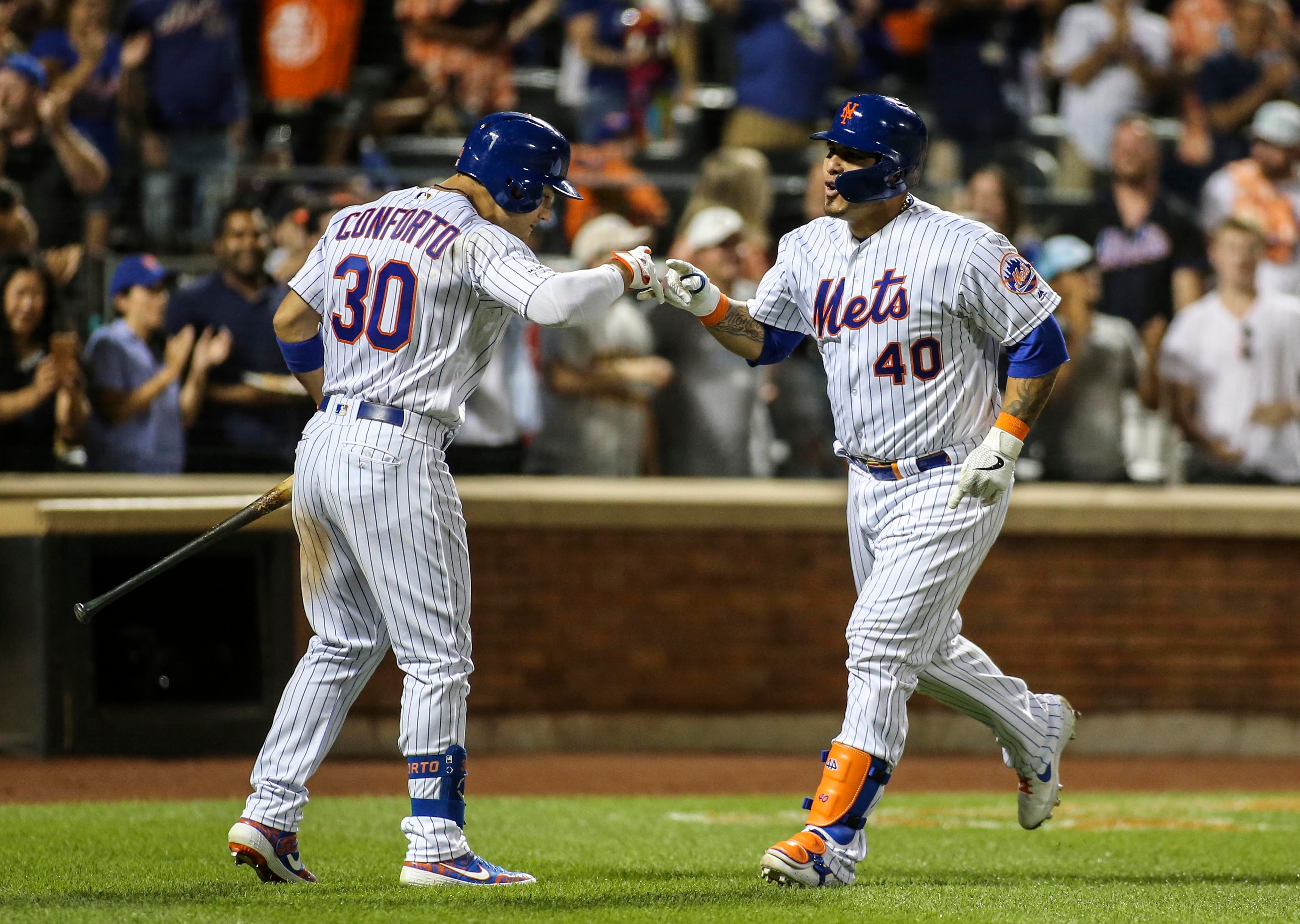 Aug 10, 2019; New York City, NY, USA; New York Mets catcher Wilson Ramos (40) is greeted by right fielder Michael Conforto (30) after hitting a solo home run in the fourth inning against the Washington Nationals at Citi Field. Mandatory Credit: Wendell Cruz-USA TODAY Sports / Wendell Cruz