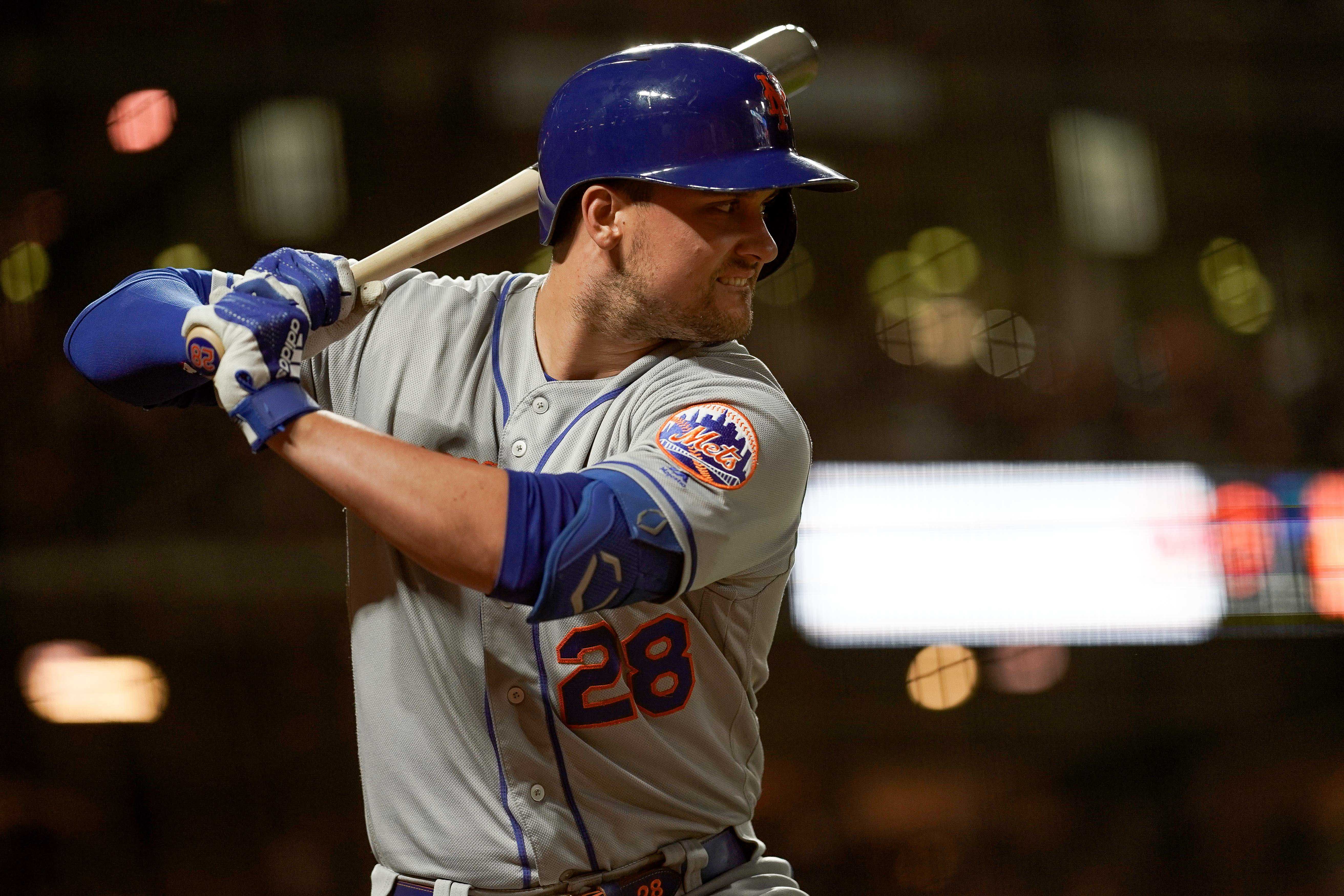 Jul 19, 2019; San Francisco, CA, USA; New York Mets third baseman J.D. Davis (28) prepares to bat against the San Francisco Giants during the eighth inning at Oracle Park. Mandatory Credit: Stan Szeto-USA TODAY Sports / Stan Szeto