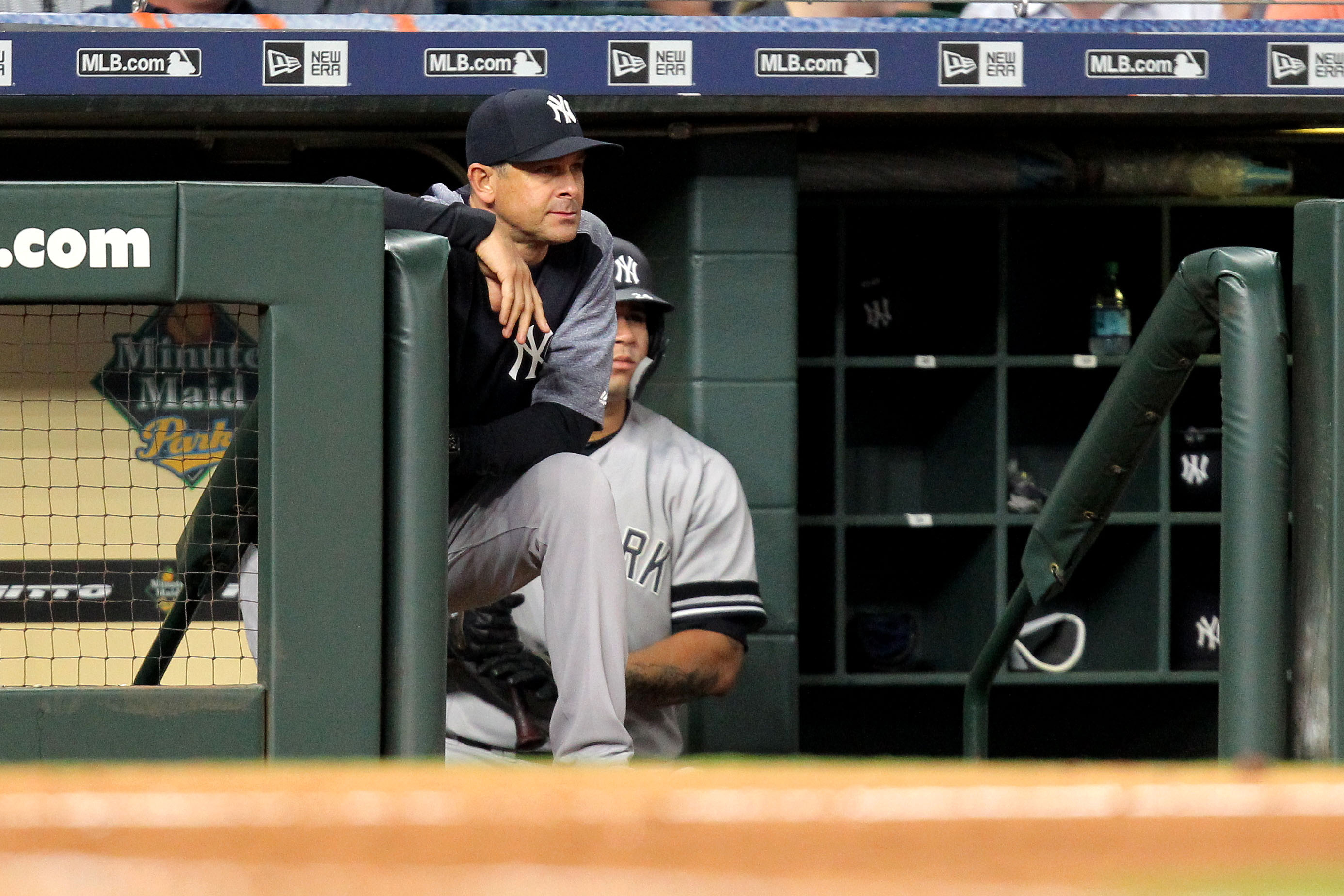 Apr 10, 2019; Houston, TX, USA; New York Yankees manager Aaron Boone (17) watches the game from the dugout against the Houston Astros during the eighth inning at Minute Maid Park. Mandatory Credit: Erik Williams-USA TODAY Sports / Erik Williams