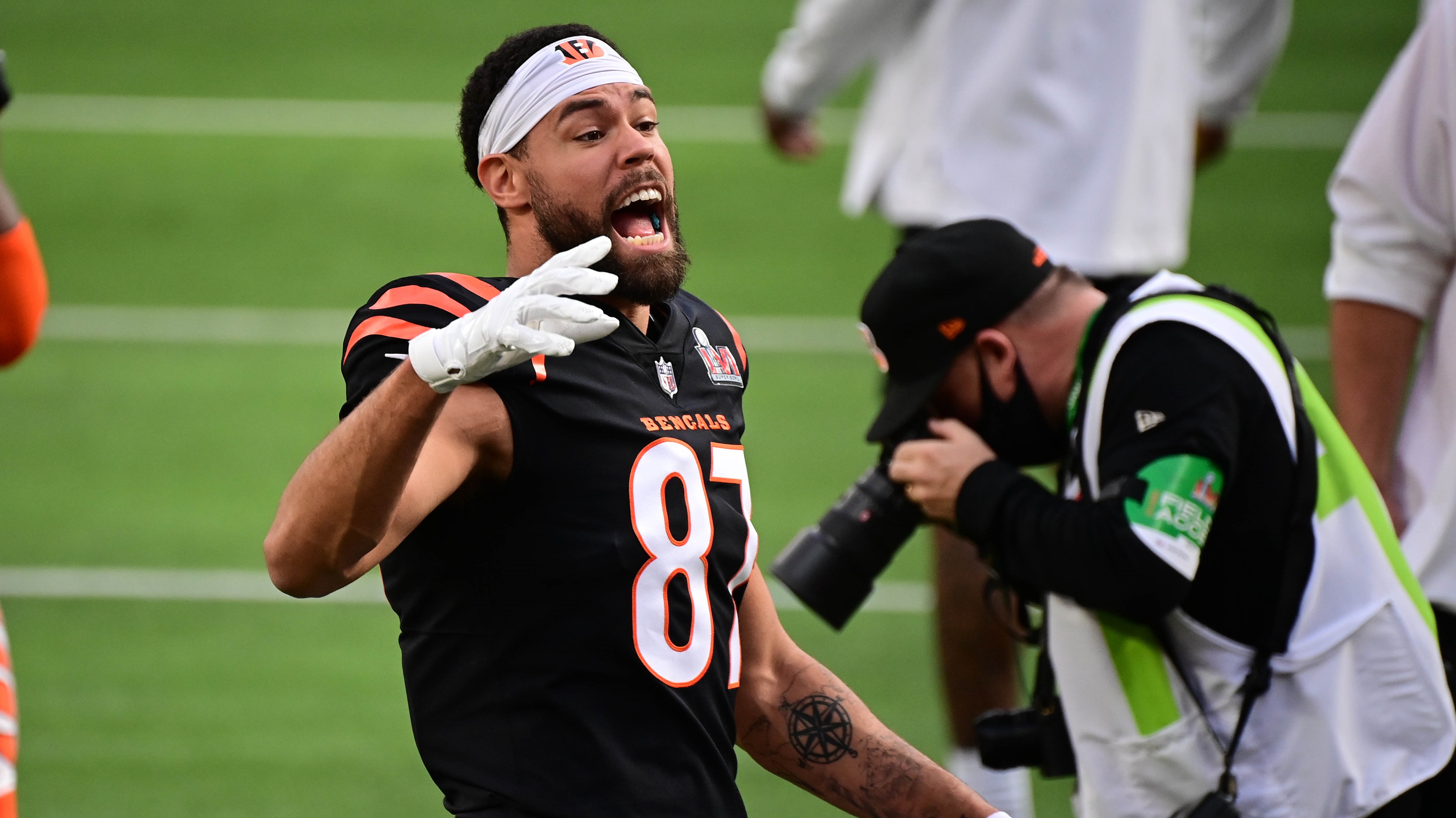 Feb 13, 2022; Inglewood, California, USA; Cincinnati Bengals tight end C.J. Uzomah (87) yells prior to the game against the Los Angeles Rams in Super Bowl LVI at SoFi Stadium. Mandatory Credit: Gary A. Vasquez-USA TODAY Sports / Gary A. Vasquez-USA TODAY Sports