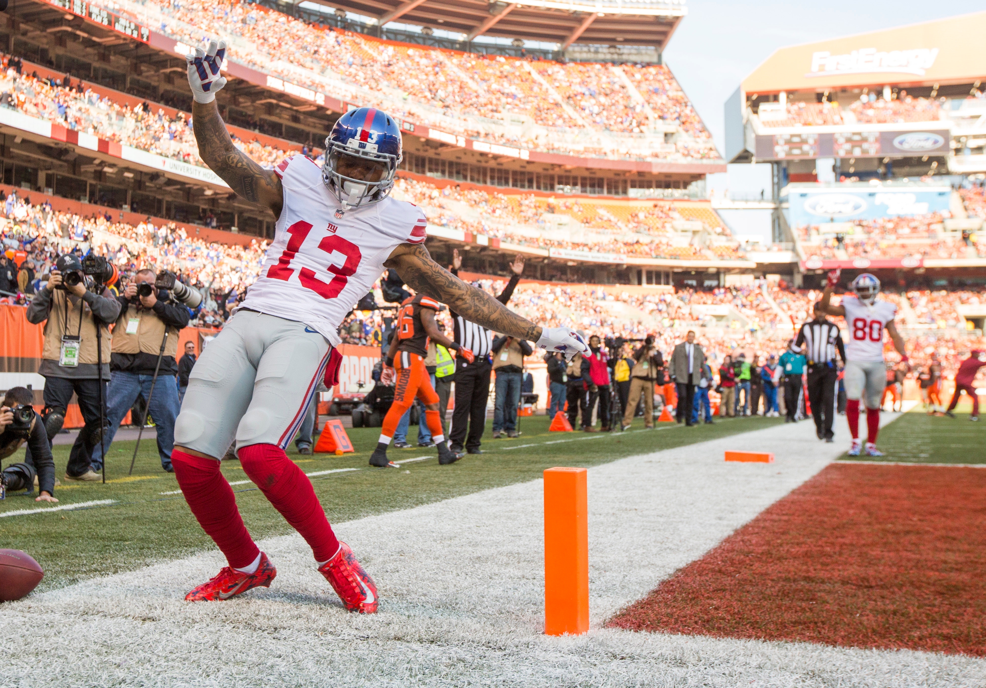 Nov 27, 2016; Cleveland, OH, USA; New York Giants wide receiver Odell Beckham (13) celebrates his touchdown run against the Cleveland Browns during the second quarter at FirstEnergy Stadium. Mandatory Credit: Scott R. Galvin-USA TODAY Sports / Scott Galvin