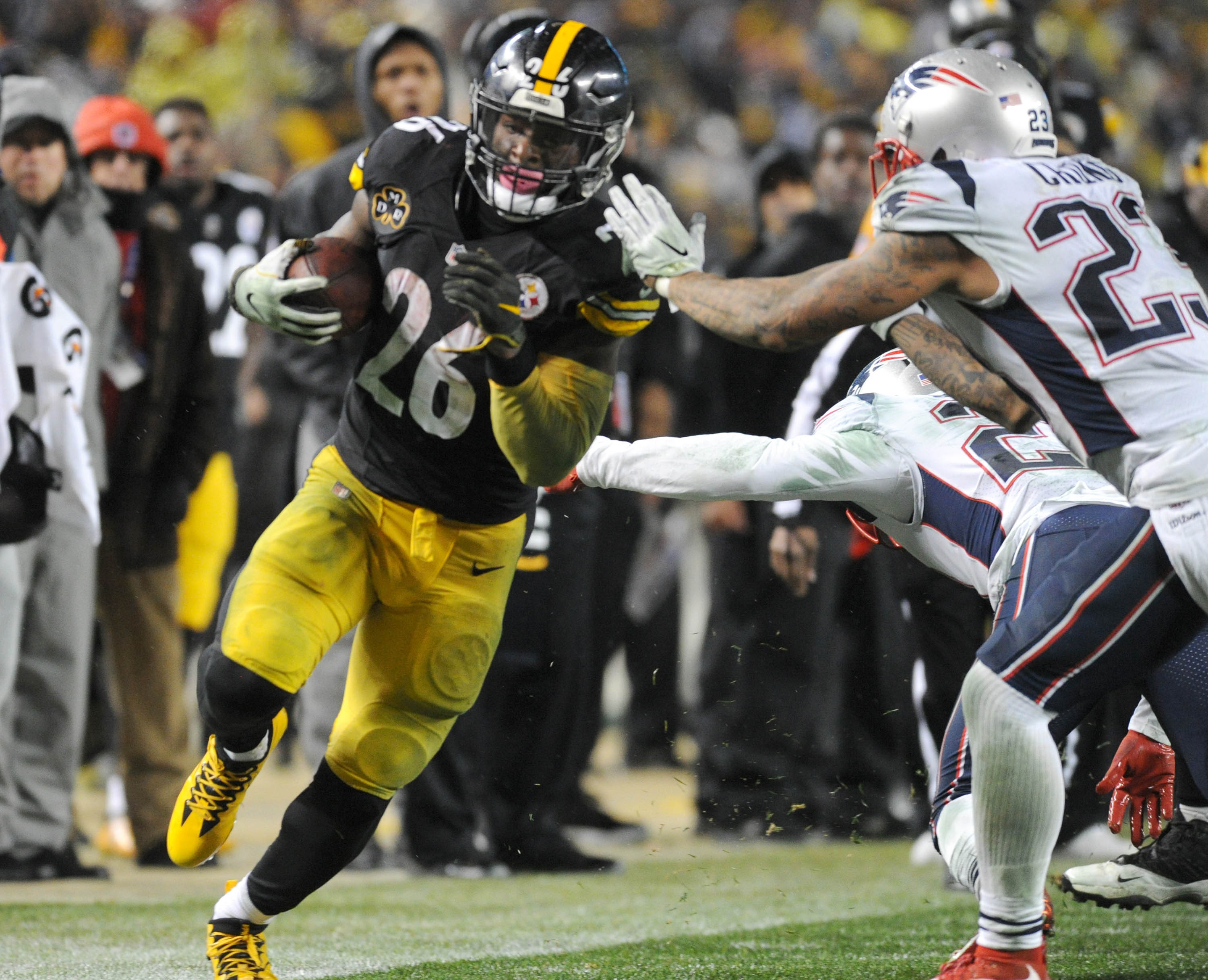 Pittsburgh Steelers running back Le'Veon Bell is pushed out of bounds by New England Patriots safety Patrick Chung in the third quarter at Heinz Field. / Philip G. Pavely/USA TODAY Sports