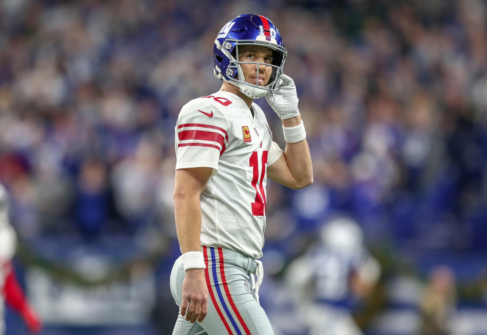 New York Giants quarterback Eli Manning reacts after throwing a interception to Indianapolis Colts free safety Malik Hooker during the second half at Lucas Oil Stadium. / Mykal McEldowney/IndyStar via USA TODAY NETWORK
