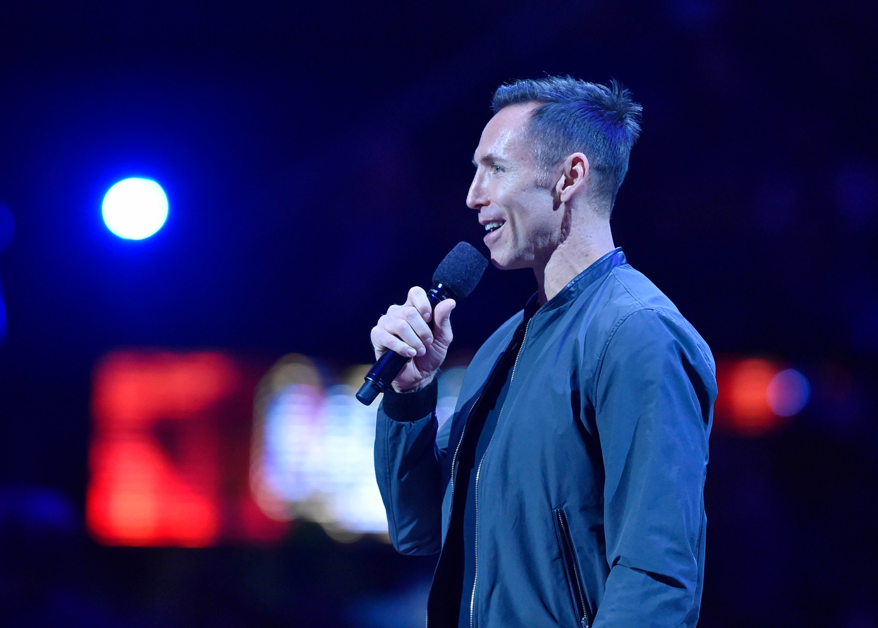 Feb 14, 2016; Toronto, Ontario, CAN; Steve Nash addresses the crowd before the NBA All Star Game at Air Canada Centre. / Bob Donnan-USA TODAY Sports