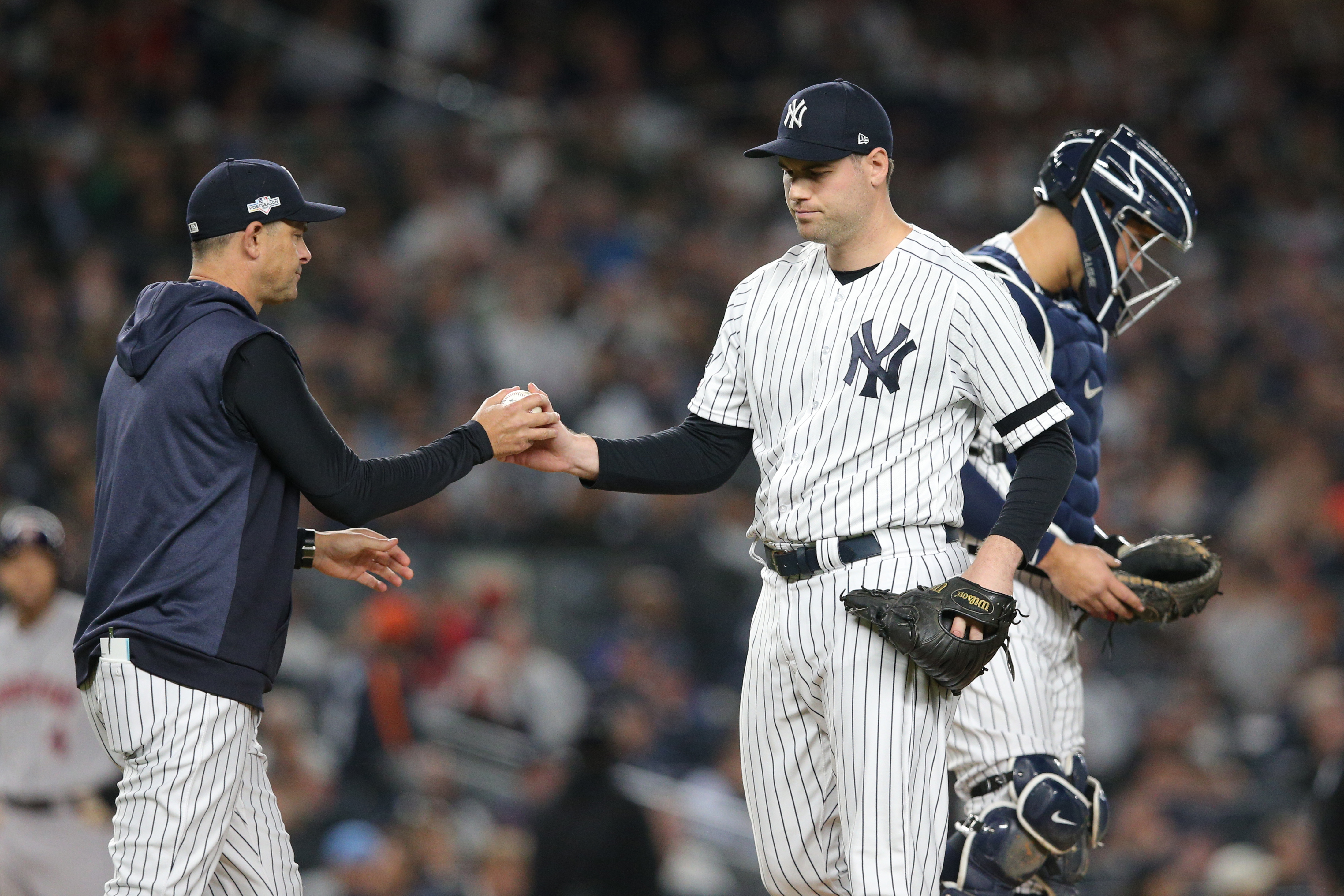 Oct 15, 2019; Bronx, NY, USA; New York Yankees relief pitcher Adam Ottavino (0) hands the ball to manager Aaron Boone (17) during the fifth inning of game three of the 2019 ALCS playoff baseball series against the Houston Astros at Yankee Stadium. Mandatory Credit: Brad Penner-USA TODAY Sports / Brad Penner