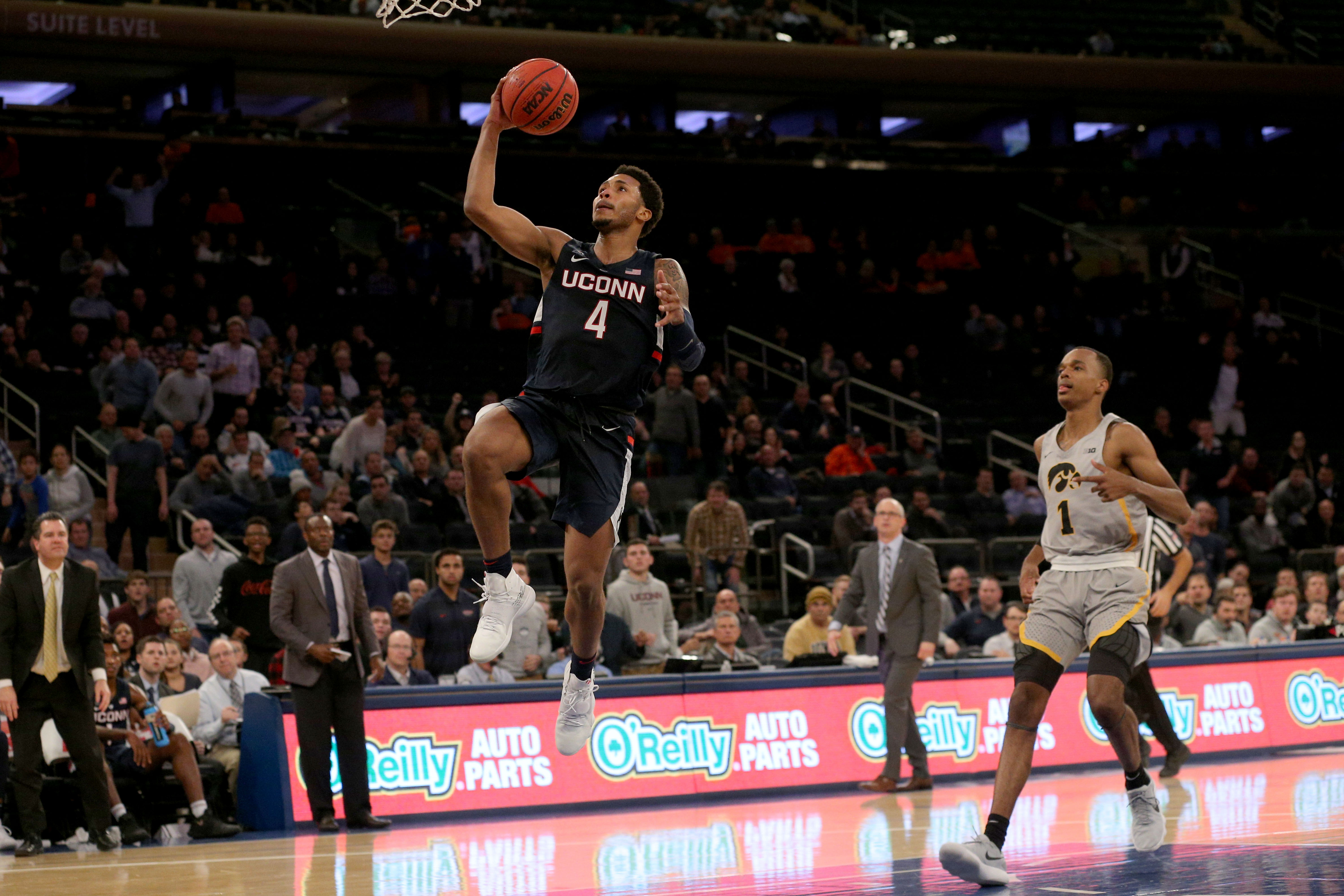 Nov 16, 2018; New York, NY, USA; Connecticut Huskies guard Jalen Adams (4) drives to the basket against Iowa Hawkeyes guard Maishe Dailey (1) during the second half at Madison Square Garden. Mandatory Credit: Brad Penner-USA TODAY Sports / Brad Penner