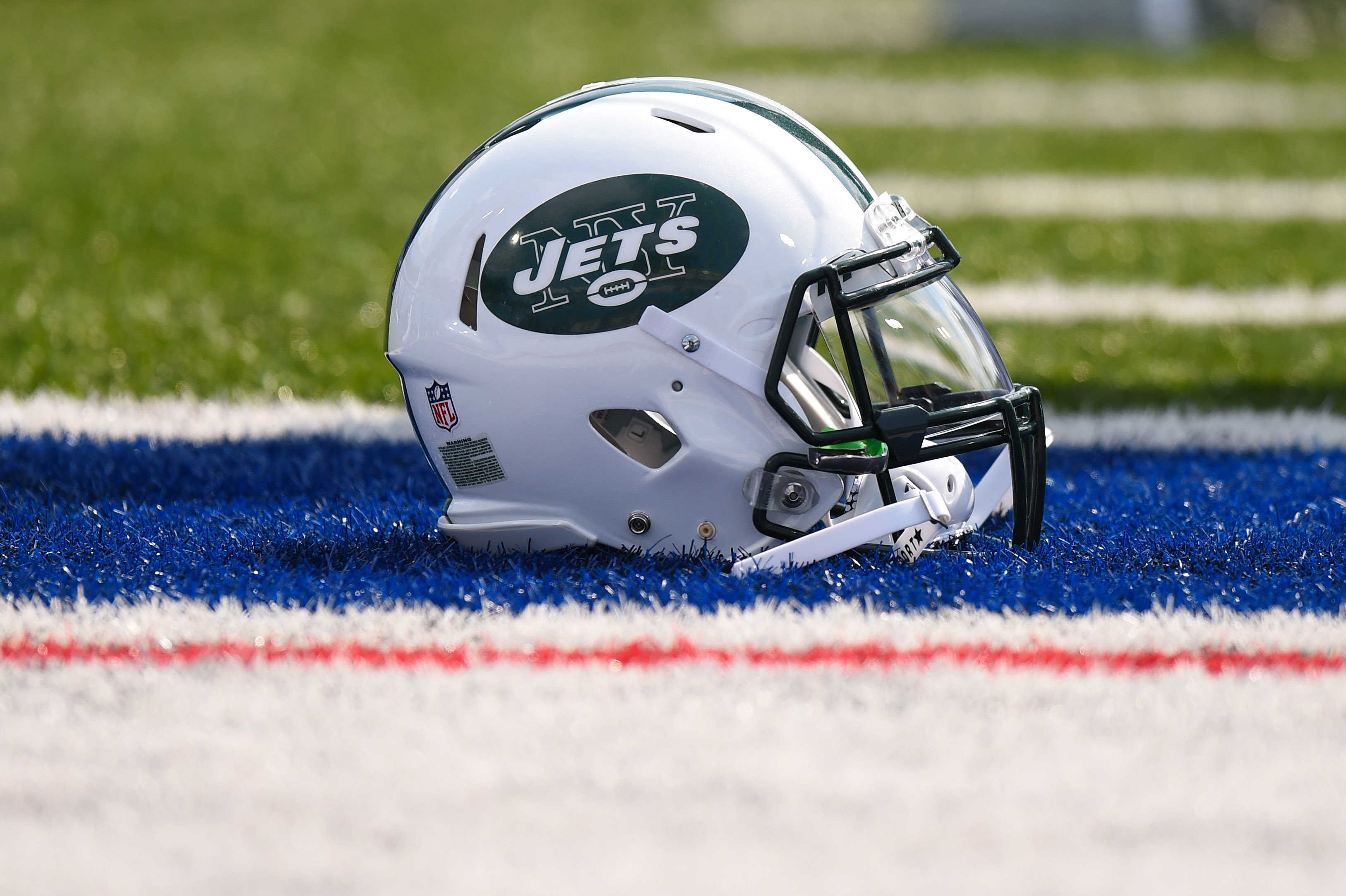 Sep 10, 2017; Orchard Park, NY, USA; General view of a New York Jets helmet on the field before a game against the Buffalo Bills at New Era Field. Mandatory Credit: Rich Barnes-USA TODAY Sports / Rich Barnes