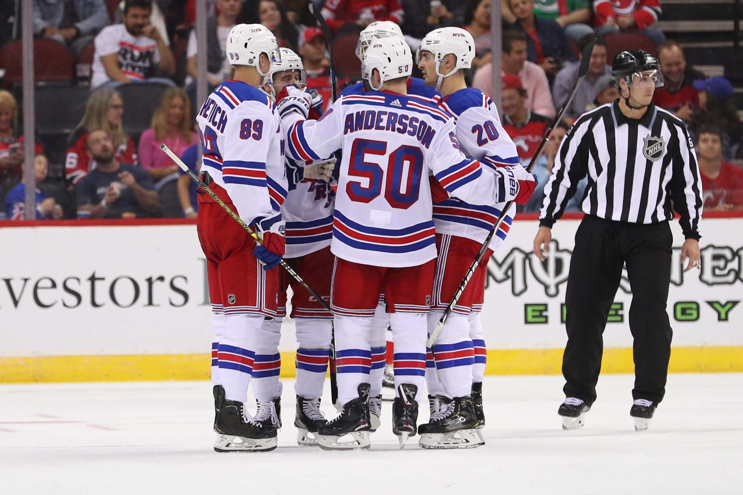 Sep 17, 2018; Newark, NJ, USA; The New York Rangers celebrate a goal by New York Rangers right wing Pavel Buchnevich (89) during the second period of their game against the New Jersey Devils at Prudential Center. Mandatory Credit: Ed Mulholland-USA TODAY Sports / Ed Mulholland