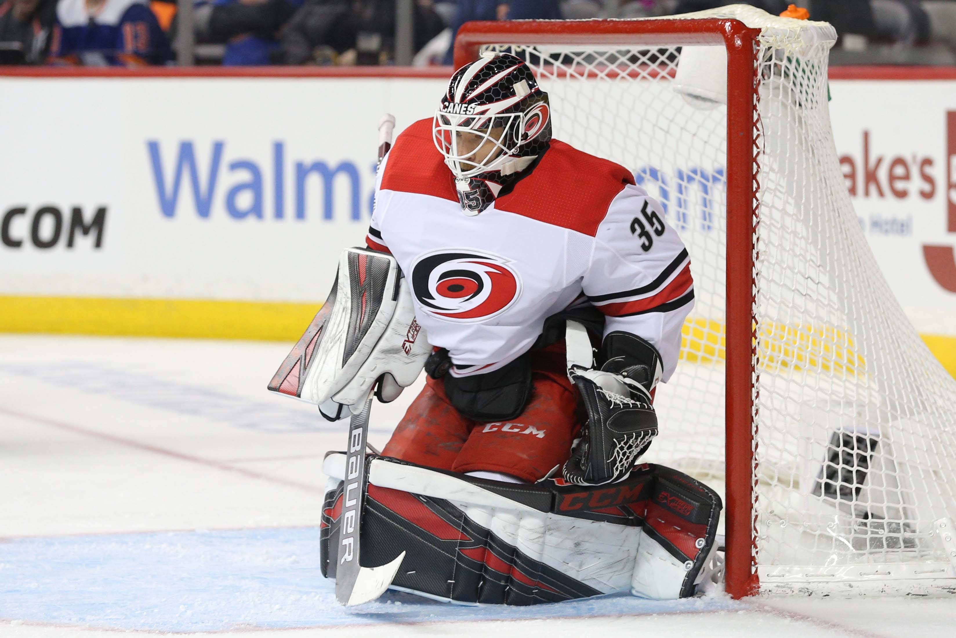 Apr 28, 2019; Brooklyn, NY, USA; Carolina Hurricanes goalie Curtis McElhinney (35) makes a save against the New York Islanders during the second period of game two of the second round of the 2019 Stanley Cup Playoffs at Barclays Center. Mandatory Credit: Brad Penner-USA TODAY Sports / Brad Penner