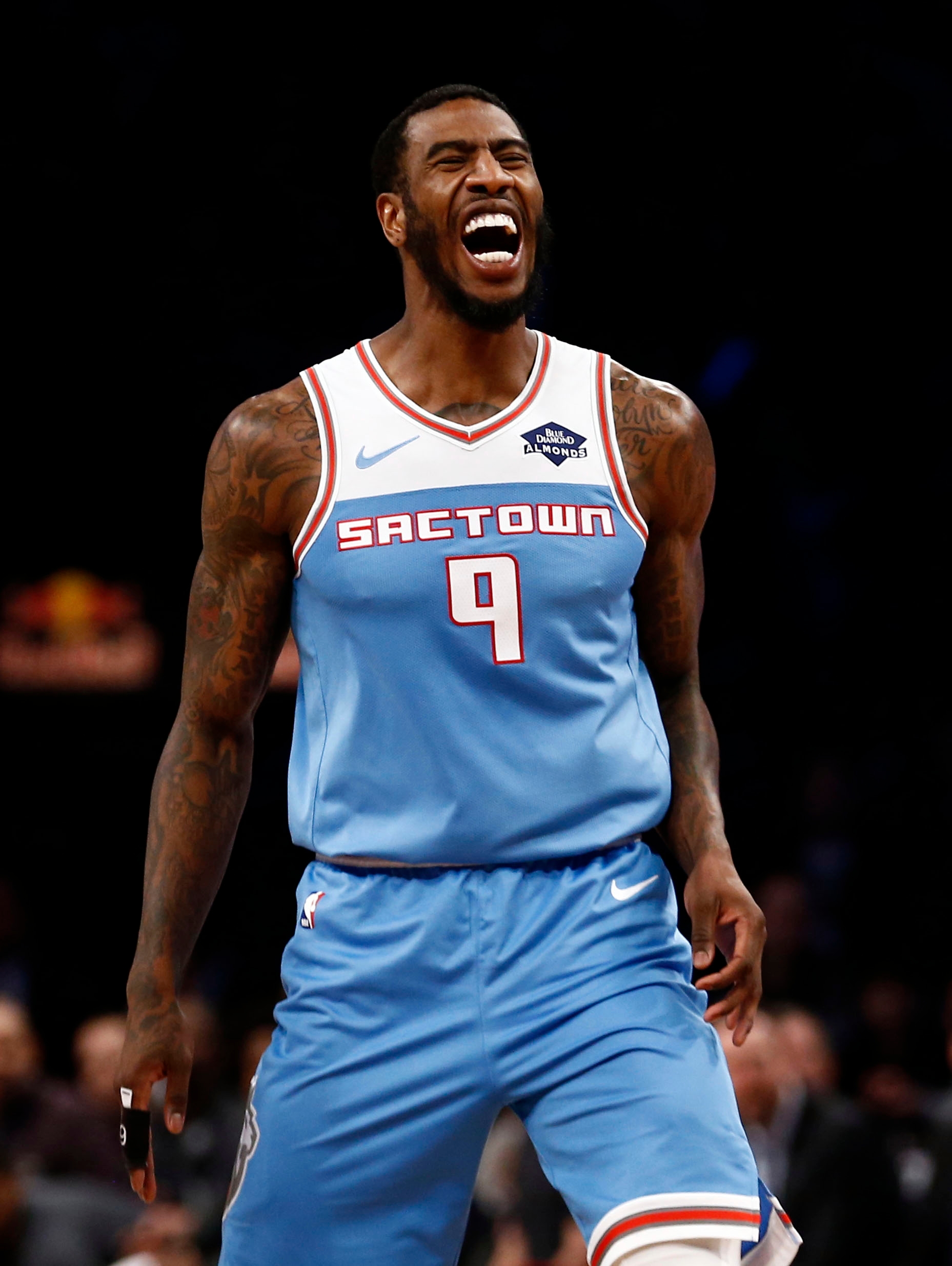 Jan 21, 2019; Brooklyn, NY, USA; Sacramento Kings guard Iman Shumpert (9) reacts in the first quarter against the Brooklyn Nets at Barclays Center. Mandatory Credit: Nicole Sweet-USA TODAY Sports / Nicole Sweet