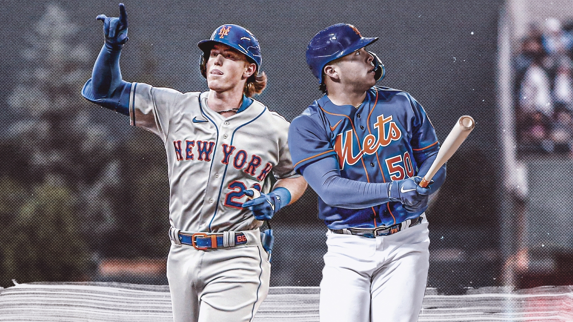 Oct 4, 2022; New York City, New York, USA; New York Mets catcher Francisco Alvarez (50) talks to first base coach Wayne Kirby (54) in the dugout during the ninth inning against the Washington Nationals at Citi Field. / Brad Penner-USA TODAY Sports